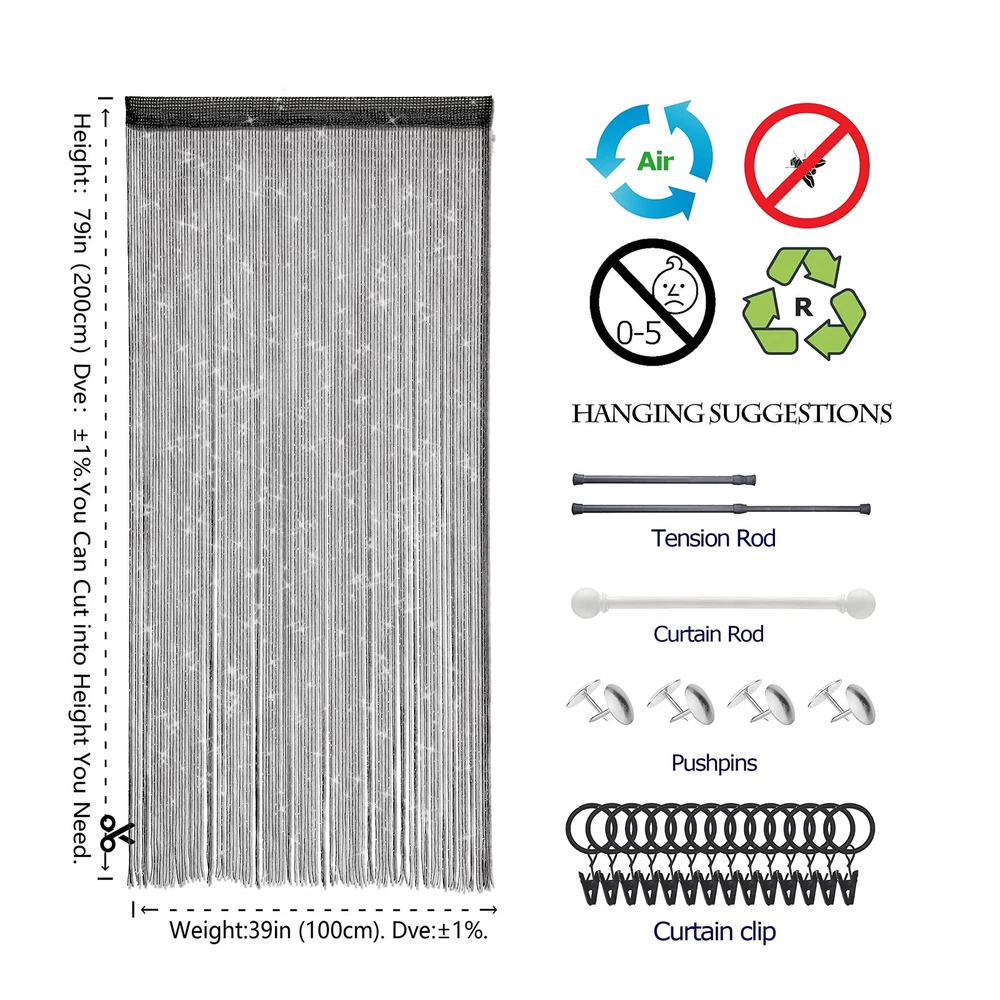 39x79 Inch Door String Curtain Doorway Beads Curtain Haning Room Divider Features: ✔️APPLICATIONS: Beaded Curtain Door String curtains are suitable for your doorways window, wall, living room, bedroom,, patio, closet, kitchen, office, balcony, wall, bookcase, study room, desk, laundry room door or window decoration; More places are waiting for you to discover. ✔️SIZE:100×200cm(39"×79"); [Please note]-Sparse or dense depends on the hanging quantity, more width and density, please add quantity as appropriate. ✔️MATERIAL: 100% Polyester; String curtain panels are silver Lurex foil, each Strings has a stunning glitter effect. ✔️Easy to Hang: The String curtains hang using any standard curtain rod, if too long, you can easily trim size you need;It is a little bit elastic, we can trim them to flush height.These are not toys and are not intended for children to play with or move around unsupervised. ✔️FUNCTIONS:This beaded curtain is generally hung on French windows, doors, walls or other spaces you want to divide. It can create a relaxing atmosphere. It has a good ventilation effect and can block the animals from the outside to a certain extent. Description: About This Product: Material: Curtains are made of eco-friendly 100% polyester. Dimensions: 35×79in/90×200cm. You can trim them to the size and shape you want. Weight: 8oz, (220g) Per Pcs, heavier design better sag. Health: No harmful substances will be produced in the sun. HANG: Pole pocket. Suitable for all kinds of rods. Package includes: 1pc String Curtain Panel. Application: Durable and attractive rope curtain panels for room decor. A modern way to decorate the window or door. These string curtains have a pocket at the top for tension rod, pole or wire. Great for doors, windows, weddings, coffee houses, homes, offices, reception rooms, hotels. Separate spaces to provide a private and comfortable space for your work or rest. Soft sunlight and string curtains create a beautiful picture in your home. Please note: Please Unpack gradually to avoid tangling the strings. If you need a wider width, simply order more String Panels. Hand wash only.Simply rinse with water. If machine washable, bundle in sections first. Please pass slowly and watch out for children and pets. Colors may vary slightly due to and screen settings. Due to handmade, please allow slight size difference, deviation: ±1%. 🌻 If you need more quantity than shown available - just send me a message and I'll increase the purchased limit for you 🌻 SHIPPING We are always working hard to ensure your package arrives as soon as possible. Please understand that some factors like weather, high postal traffic, and the performance of shipping companies are outside of our control. We offer free shipping to the lower 48 states. We do not accept P.O. Boxes. Please provide a physical address. Thank you 🌻 TRANSLATE with x English Arabic Hebrew Polish Bulgarian Hindi Portuguese Catalan Hmong Daw Romanian Chinese Simplified Hungarian Russian Chinese Traditional Indonesian Slovak Czech Italian Slovenian Danish Japanese Spanish Dutch Klingon Swedish English Korean Thai Estonian Latvian Turkish Finnish Lithuanian Ukrainian French Malay Urdu German Maltese Vietnamese Greek Norwegian Welsh Haitian Creole Persian