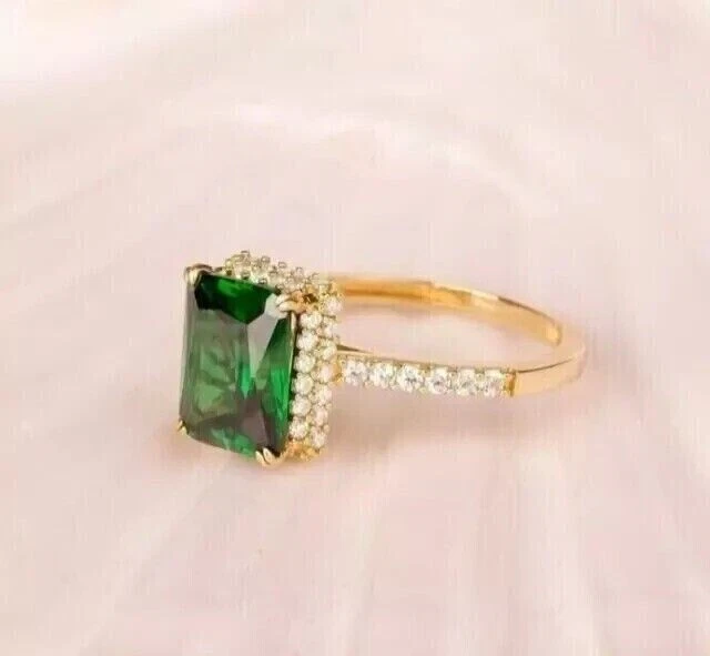 3CT Cushion Cut Lab Created Emerald Halo Engagement Ring 14K Yellow Gold Plated