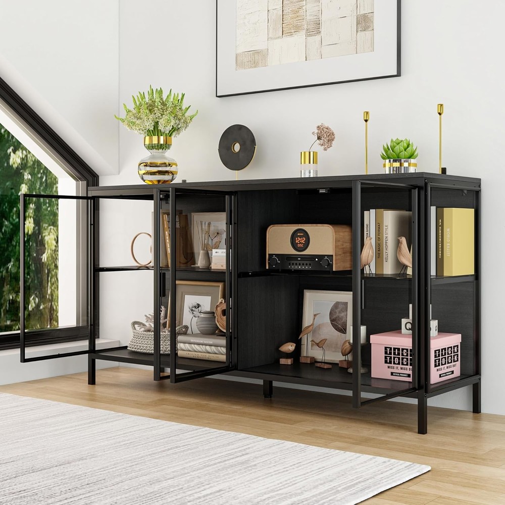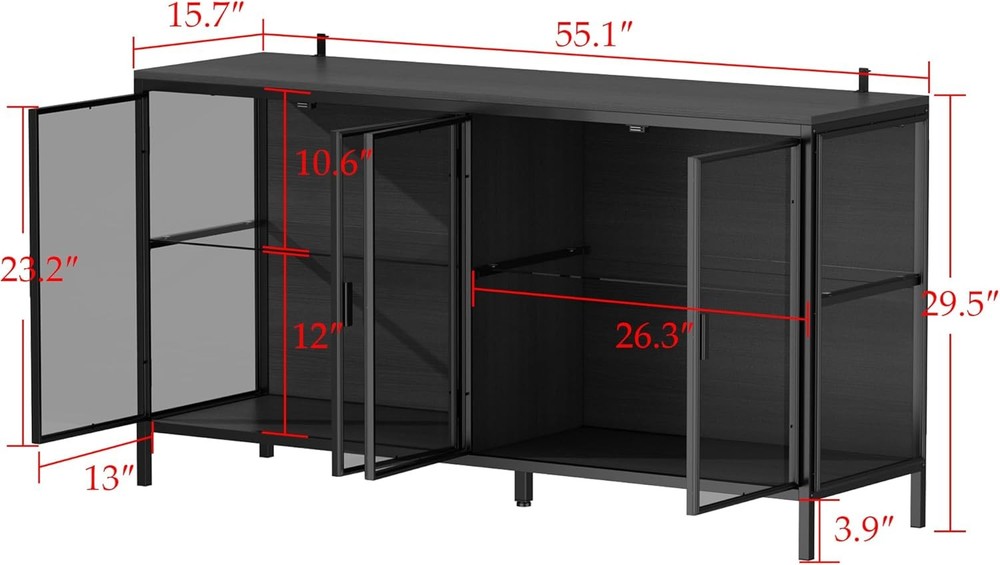 Product Description About this item [Storage Cabinet with LED Light] - black storage cabinte with glass doors features switch control LED lights, 3 colors adjustable: warm yellow, natural and cool white. The storage shelves are glass, the high-definition glass shelves presenting your collection perfectly, making it visible even from a distance. [Sturdy & Durable] - This storage display cabinet is crafted from engineered MDF board, iron and glass. The thick metal frames and top panel is sleek and easy cleaning, the sturdy legs offer reliable support. The glass shelves can hold weight up to 22 lbs, the top can hold up to 33 lbs. [Large Capacity] - Overall sizes: 55.1”W x 15.7”D x 29.5”H. Total 4 storage compartments, each compartment: 26.6”W x 15”D. This sideboard cabinet with lights is luxury with sleek surface and durable materials. Black panels, transparent glass doors and metal framed doors are creating luxury charming. [Versatile Storage Cabinet] - This black cabinet is suitable for many occasions, like entryway, hallway, living room, kitchen, dining room and office. Also you can treat it as sideboard cabinet, cupboard cabinet, accent cabinet, bar cabinet, curio & display cabinet, console table and so on. [Assembly Required] - This buffet cabinet with storage is easy to assemble, you just need to follow the instruction manual to easily assemble a complete chest of drawers, feel free to tell us your problem. Storage Cabinet with 3-Color LED Lights, Glass Shelves & 4 Compartments, Sideboard Buffet Cabinet with Solid Metal Legs, Modern Display Cabinet for Living Room Dining Room, Black. black storage cabinte with glass doors features switch control LED lights, 3 colors adjustable: warm yellow, natural and cool white. The storage shelves are glass shelves, the high-definition glass shelf presents your collection perfectly, making it visible even from a distance.
