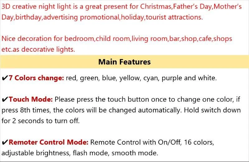 Free and fast shipping , shipping take up 1-7 Business Days 30 Day Return Accepted EASY PAYMENT via PayPal, Credit Card, PayPal Credit, Google Pay... Table Lamp LED 3d Airplane Plastic Modern Multicolor Small Touch USB Novelty 3D lights are suitable for the following situations Valentine's Day present Birthday present Wedding gifts Opening ceremony Commemorative award Advertising promotion Business gift Public relations planning Holiday gift Employee Benefits REVIEWS The product came very well packaged. I'm very happy. thank you for everything. Seller strongly recommended. This is great! I definitely recommend! Product looks amazing Delivery was fast. Excellent seller, great communication. I advise everyone to buy it!