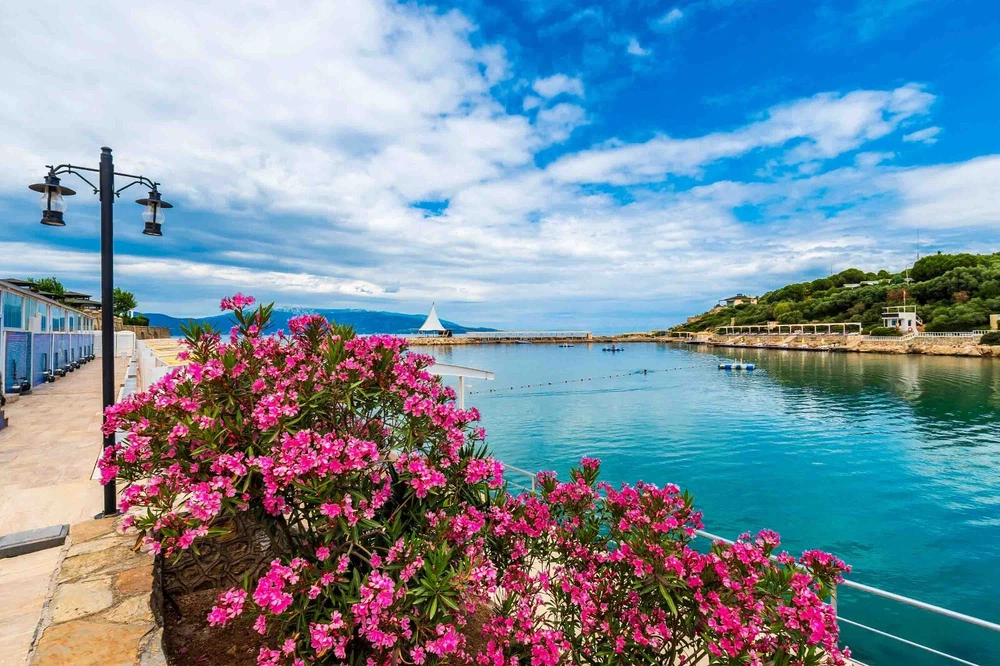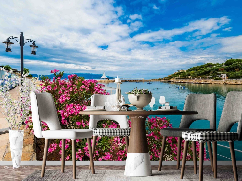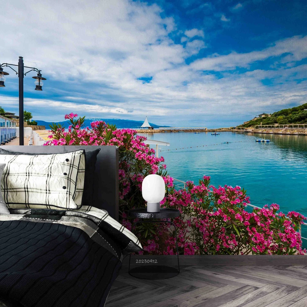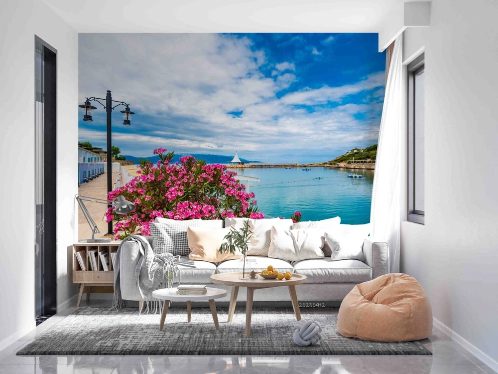 3D Blue Sky Lake Pink Floral Wall Murals Wallpaper Murals Wall Sticker