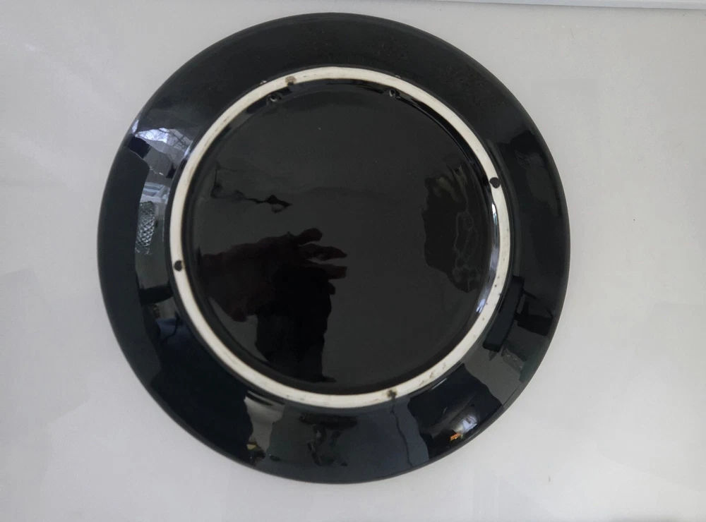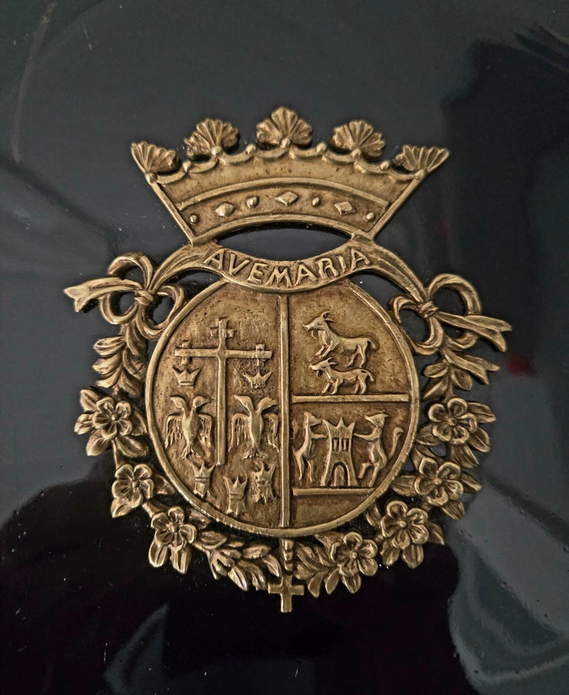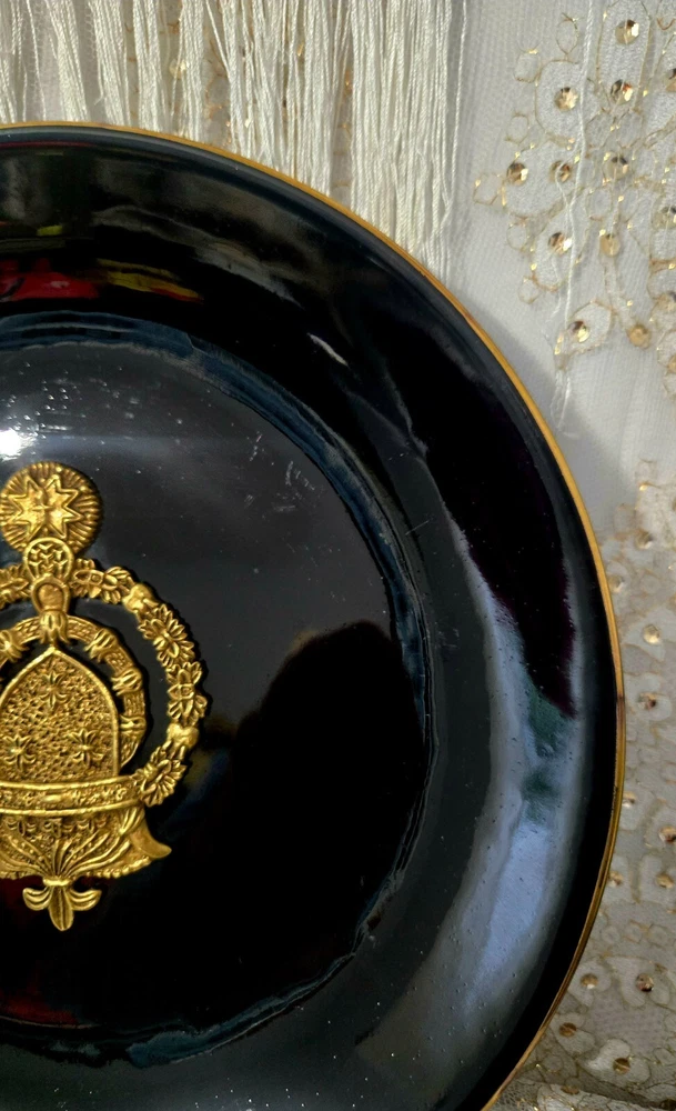 The product is a set of three heavy black ceramic collector plates with a round shape and a diameter of 10.5 inches. Each plate features a 3D brass design of various coat of arms representing Russia and Spain. These decorative plates are intended for hanging on the wall and would make a unique addition to any collector's display. There is some normal wear -- see pictures. The intricate designs and cultural significance of the coat of arms add a touch of history and elegance to these collector items. J083
