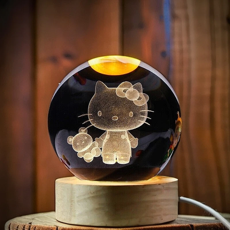 3D Carve Crystal Ball (KT&Bear) Night Light with Wooden Base Kids Gift Healing
