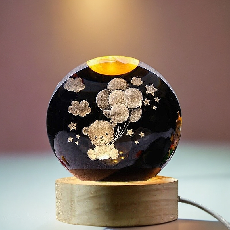 3D Carved Bear Crystal Ball Night Light with Wooden Base - Kids Gift Healing Decor