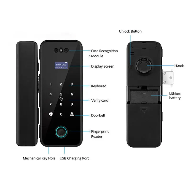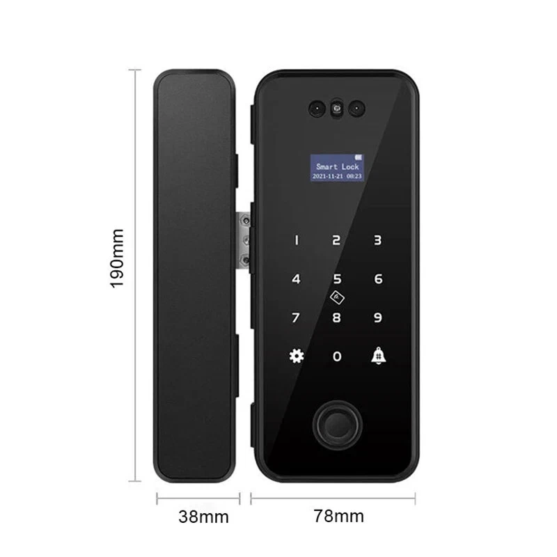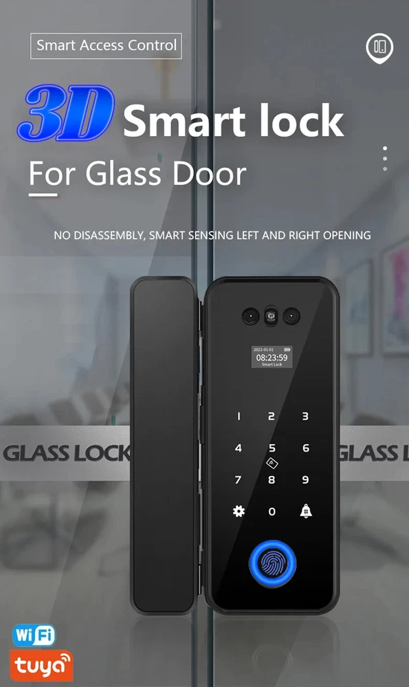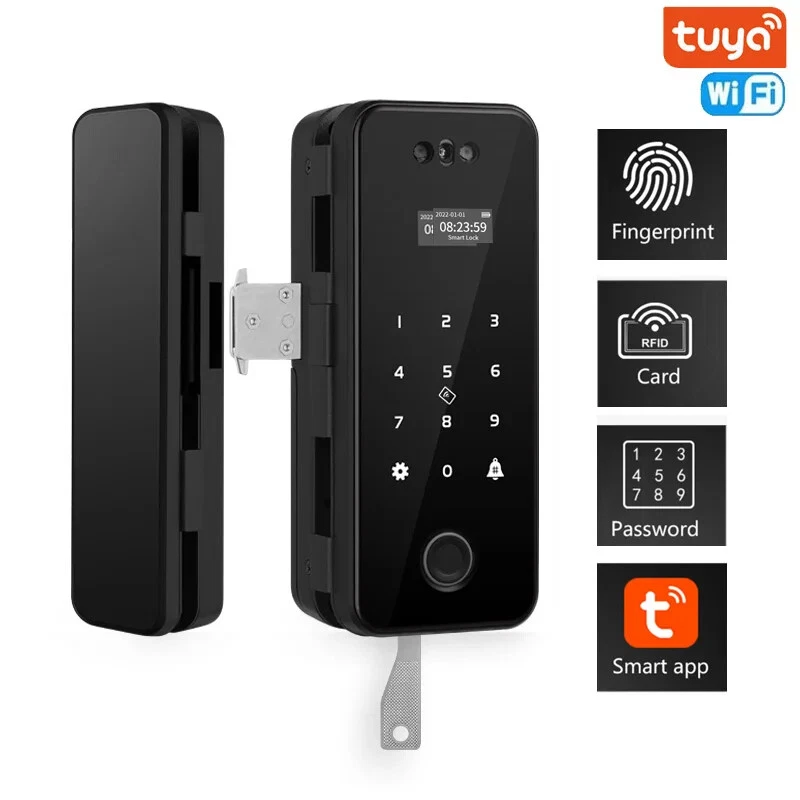 Note 1. Battery in Lock or remote controler are all removed due to shipping limitation 2. Lock is not waterproof Kits available to choose from: Kit1 (WIFI LOCK): Lock with tuya function , support card/code/fingerprint/Tuya smart app Kit2 (WIFI LOCK): Lock with tuya function and remote controler , support card/code/fingerprint/Tuya smart app/Remote controler Choose right type for your own door. Different kit comes with different accessories. for frameless galss door, ok for door thickness with 8 to 12mm. No drill needed. For framed glass and wooden door, suit for 4 to 7cm door. Need to drill on door.