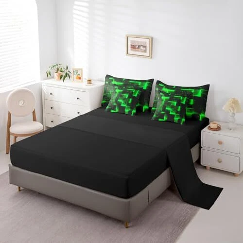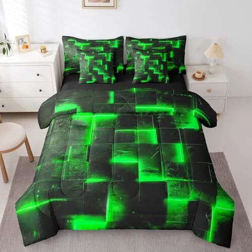 3D Geometric Bed in a Bag 7pcs Abstract Aesthetic Bedding Set, Black and Green