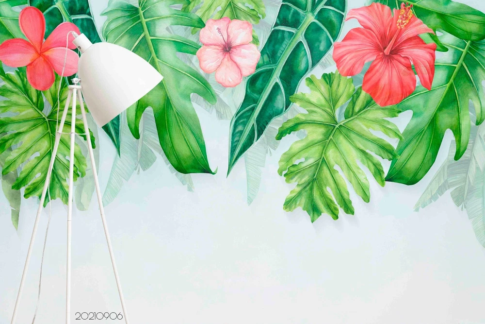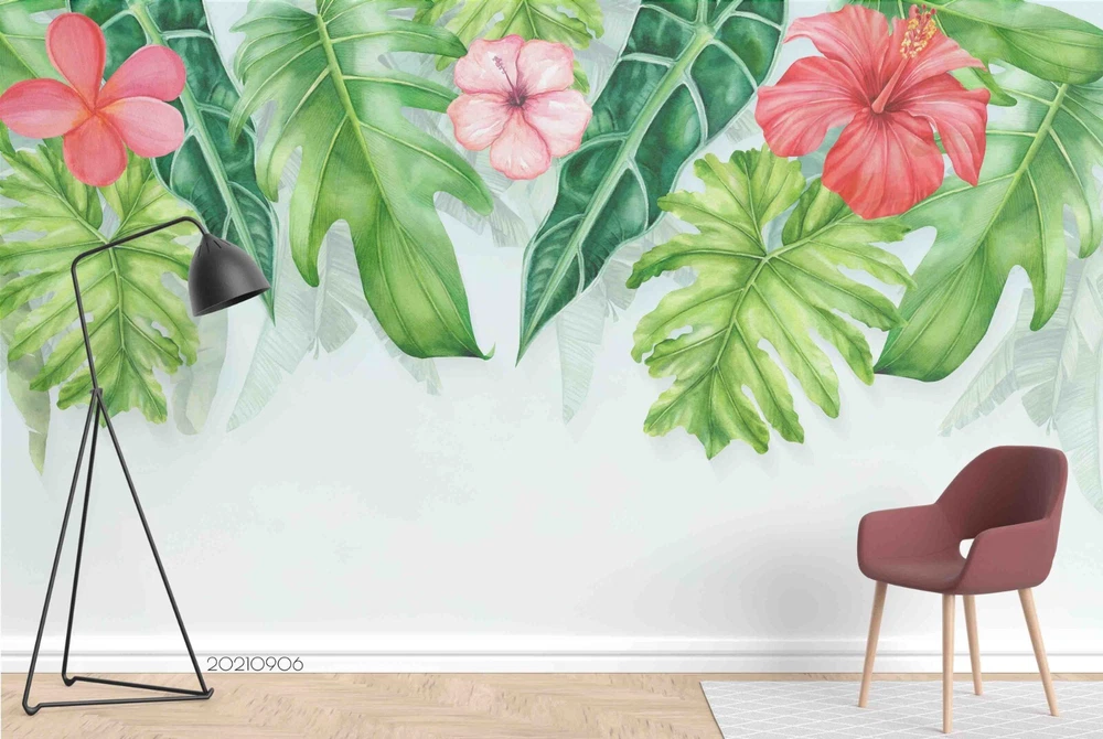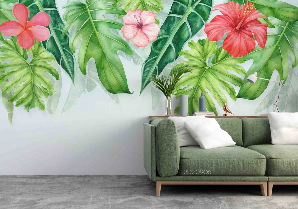 3D Green Leaf Pink Floral Wall Murals Wallpaper Murals Wall Sticker