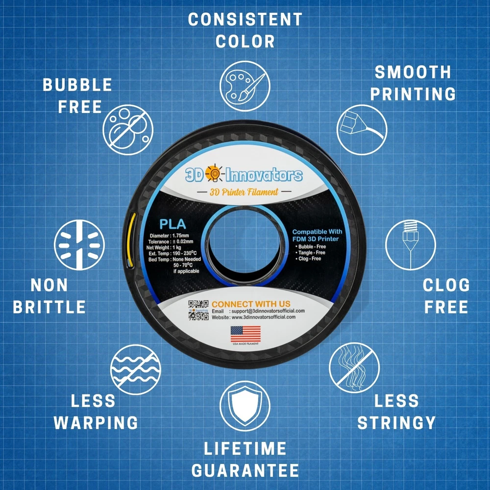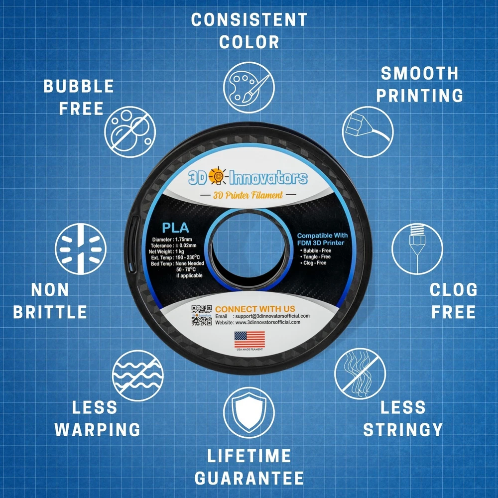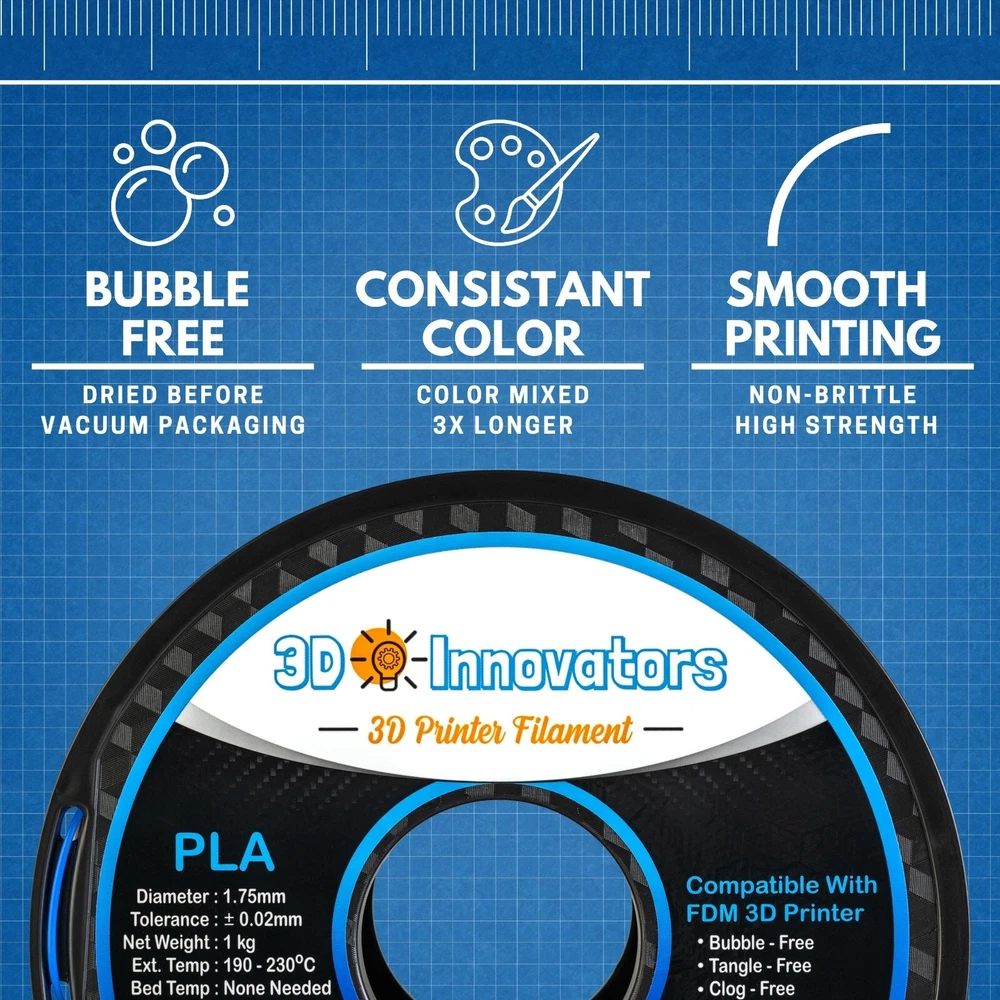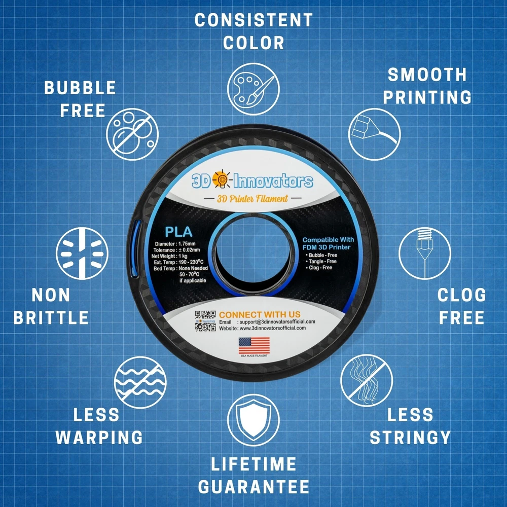 Material: PLA Type: Filament Brand: 3D Innovators Country/Region of Manufacture: United States Custom Bundle: No MPN: pla-color-1.75 Manufacturer Warranty: 1 Month Compatible Model: Most 3D Printers Filament Diameter: 1.75 mm