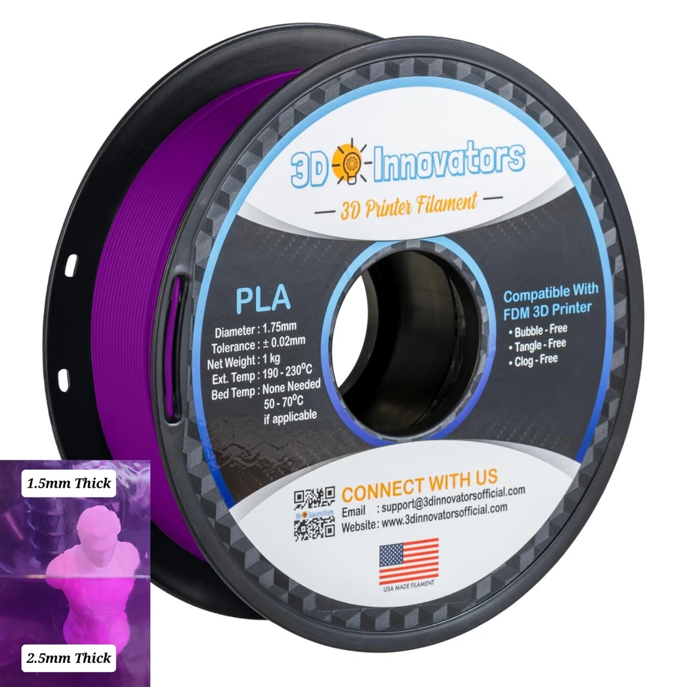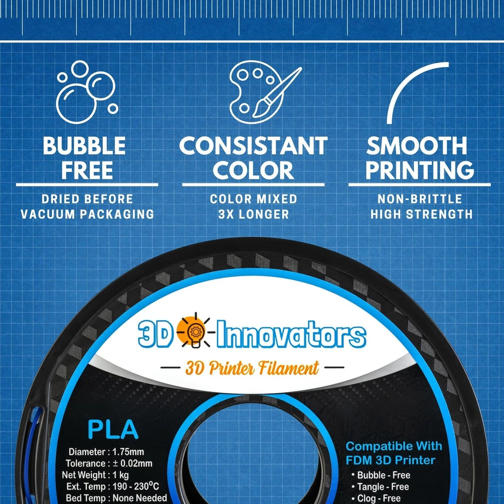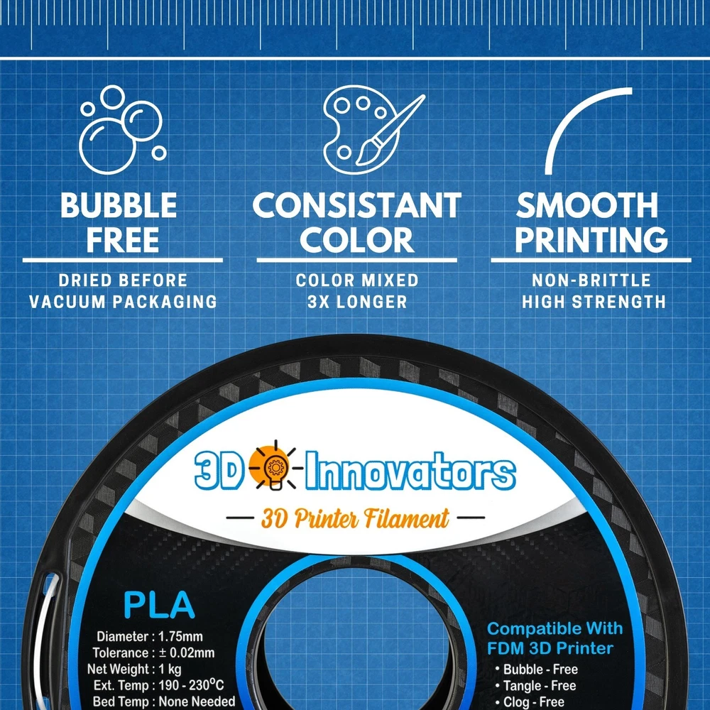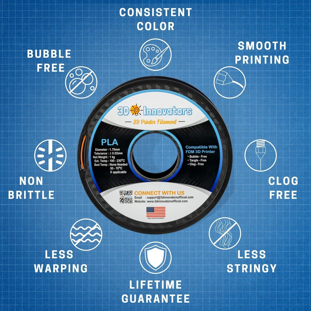 Material: PLA Type: Filament Brand: 3D Innovators Country/Region of Manufacture: United States Custom Bundle: No MPN: pla-color-1.75 Manufacturer Warranty: 1 Month Compatible Model: Most 3D Printers Filament Diameter: 1.75 mm