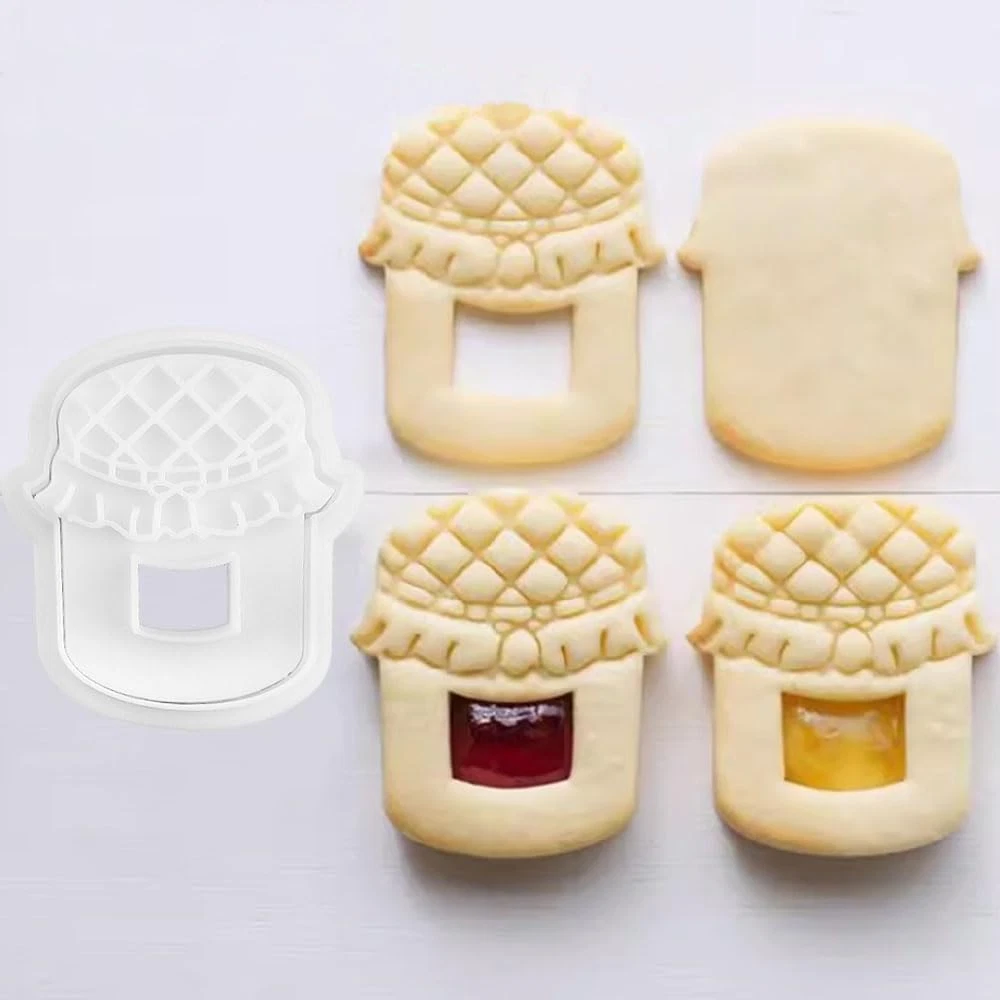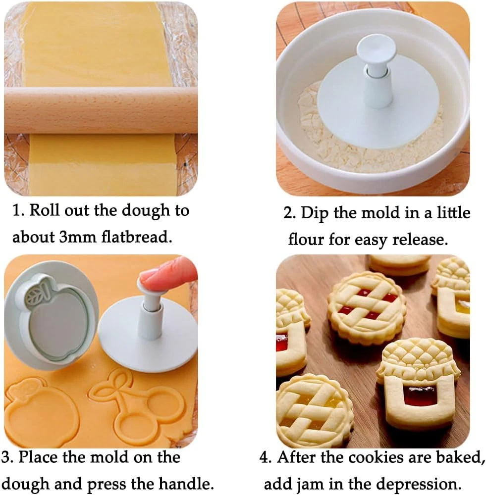 【Jam Cookie Cutter Set】4pcs/set creative jam sandwich cookie cutter set, included 2 pieces outer dies and 2 pieces inner cookie stamp mold. The cookie outer molds and inner cookie stamps need to be used together, the set include 2 sets of cute mini jam cookie cutters in different shapes, perfect for making handmade sandwich cookies. 【Small Cookie Cutters】Our sandwich cookie cutters are small and cute, the round cookie cutter measures about 5x5 cm /1.97x1.97 inches, and the jam jar shaped cookie cutter measures about 5.8x5 cm/2.28x1.97 inches, and the cutting height is about 1.2 cm/0.47 inches.(The size information is manual measurement, please allow a difference of about 1cm due to manual measurement.) 【Plastic Cookie Stamps】All cookie stamp molds are made of food grade plastic, serviceable and lightweight, not easy to deform or break, smooth surface will not scratch your hands or children, durable material make them can be used multiple times, We recommend hand washing with warm water and drying after use to maximize the life of the biscuit cutter. 【DIY Sandwich Cookies】These jam sandwich biscuit mold can be used to make a variety of sandwich cookies, you can choose the right filling according to the taste you and your family and friends like to make your favorite sandwich cookies, Jam filling includes but is not limited to chocolate jam, strawberry jam, blueberry jam, tomato sauce, mango jam, bean paste, etc. 【Practical Baking Tools】The plastic biscuit cutter mold set is easy to use, can help baking enthusiasts make a variety of flavors of sandwich cookies, is a good helper for diy jam sandwich cookies. You can also use these cute and practical molds with your children to make your favorite handmade cookies, and cultivate your children's interest in baking and hands-on skills. Product Specification Item Name: Jam Sandwich Cookie Cutters Type: Cookie Molds Material: Food-grade Plastic Color: White 2 Shapes: Round, Mini Jam Jar Round Size: About 5x5cm/1.97x1.97in Jam Jar Size: About 5.8x5cm/2.28x1.97in Cutting height: About 1.2cm/0.47in Used for: DIY cookies, biscuits, fondant, steamed buns, pie crusts, puddings, mousse, pastries, clay, etc Occasion: Kitchen, Bakery, DIY Shop, etc Package Contents: 2 Sets Jam Sandwich Cookie Cutters( 2pcs/set) Product Advantages ✔Plastic Material: Food-grade plastic material, which is safe and tasteless, easy to use and clean. ✔Cartoon Shape: Creative jam cookie cutters that can make various jam sandwich cookies. ✔Jdeal Gifts: Cute biscuit molds can be used not only for personal use but also as gifts for friends who enjoy baking. ✔Multi Use: Mini cookie molds can be used for DIY jam cookies, fondant, pastries and more! ✔Easy to use: After choosing the shape they like, just press the cutter into your cookie to create a wonderful matching shaped cookie. How To Use 1. Roll out the dough to about 8-10mm flatbread. 2. Dip the mold in a little flour for easy release. 3. Press the outer mold onto the prepared cookie dough and demould to get a sandwich cookie bottom. 4. Press the outer mold onto the dough, then put the inner mold into the outer die and press it down, finally demould to get the top of the sandwich cookie. 5. Take all the shaped cookie dough to bake. 6. Once the cookies are baked, add a little jam to the bottom cookie, then place the hollowed out top cookie on top, press gently and the jam cookies are ready.