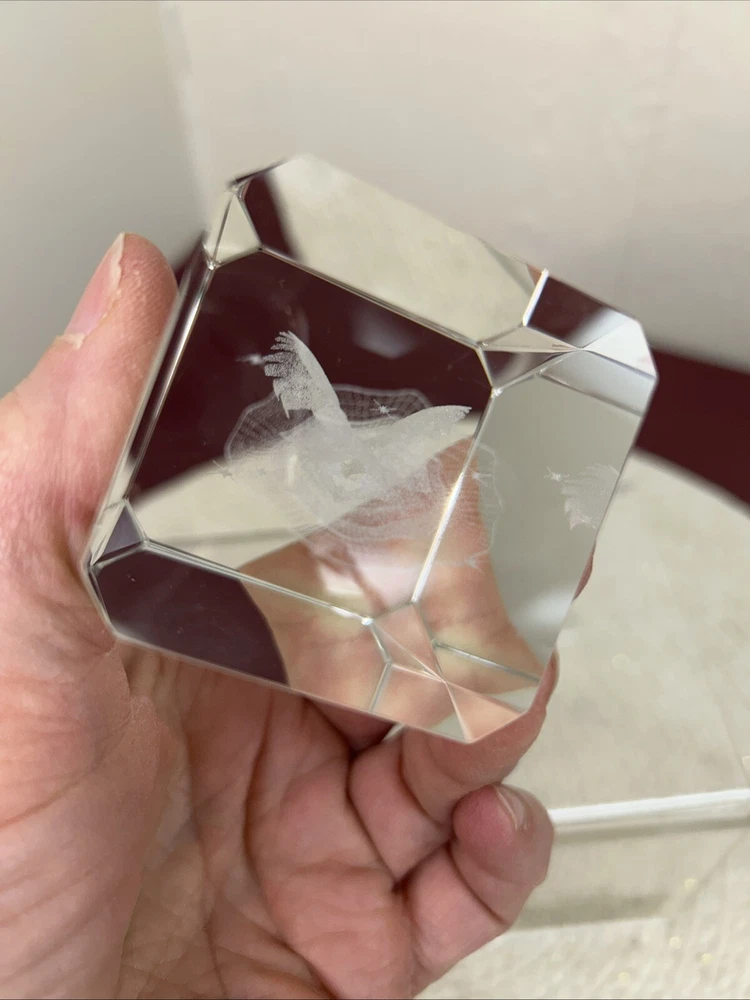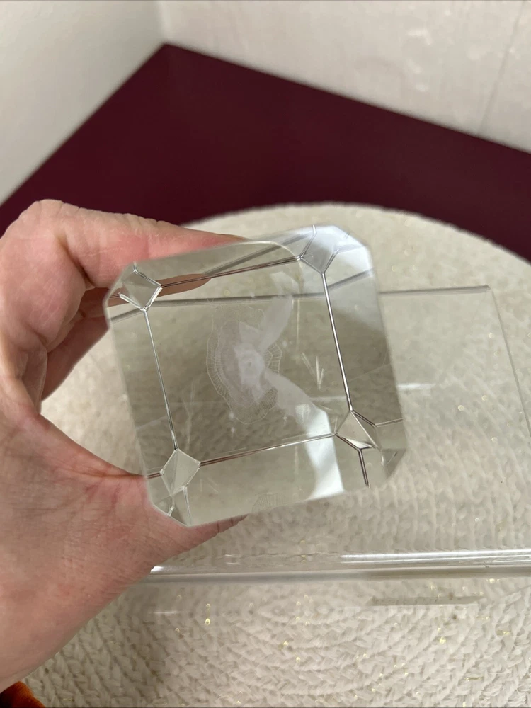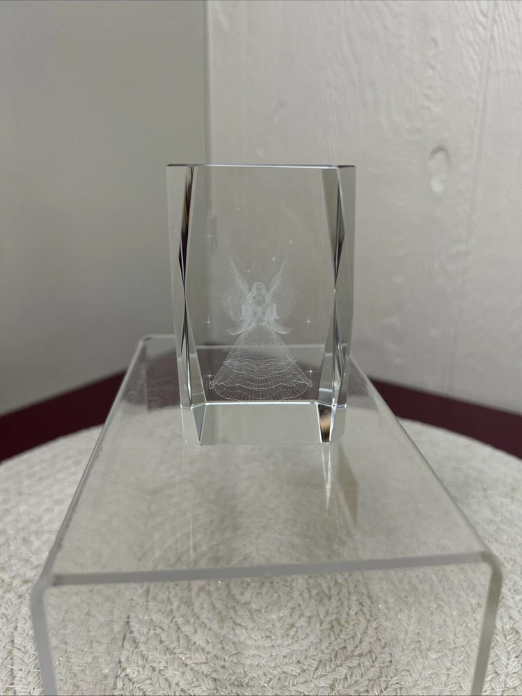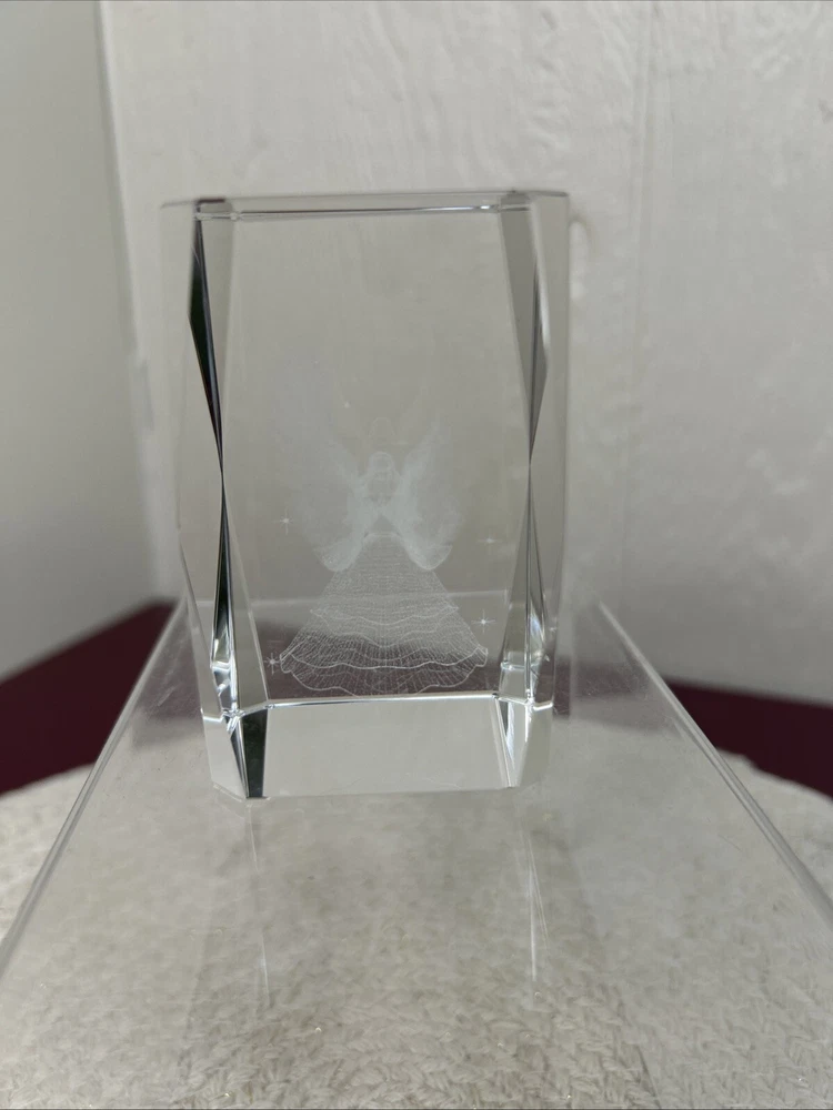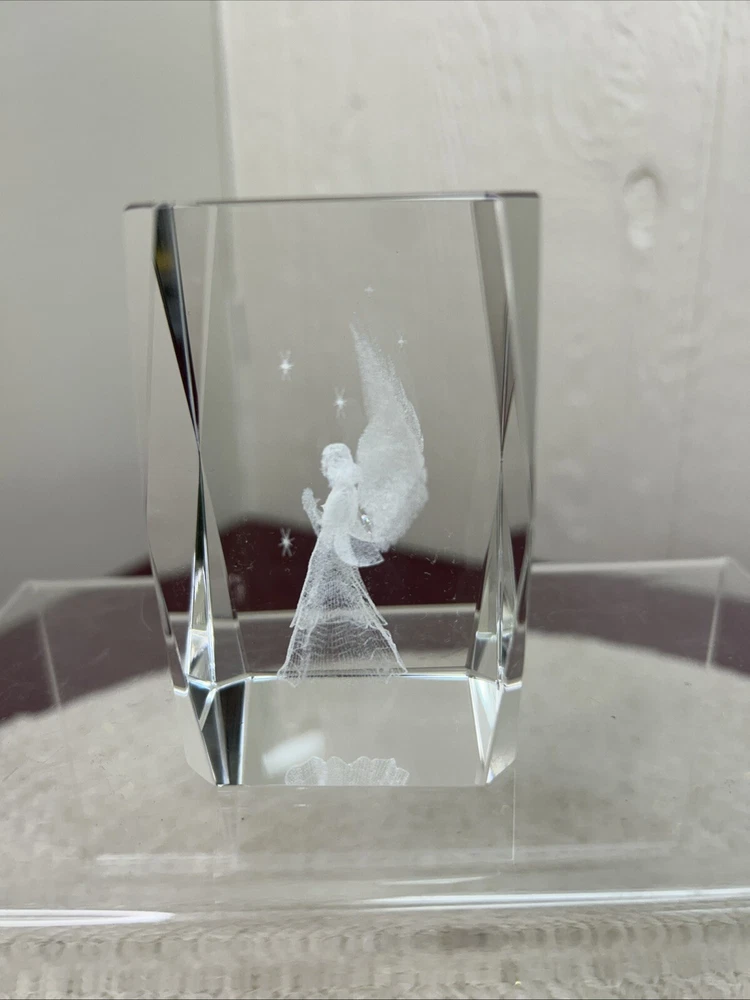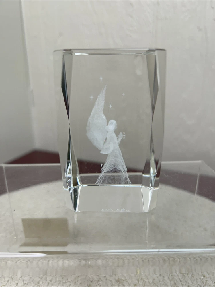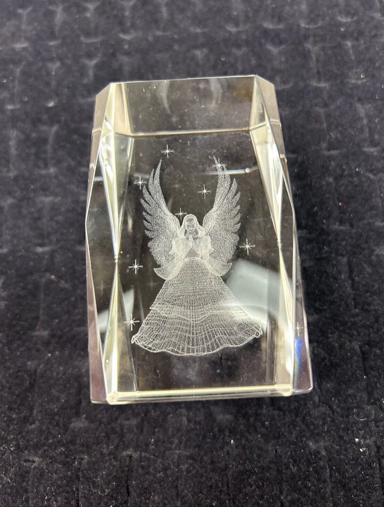 This is a laser etched glass paperweight with a beautiful image of an angel surrounded by stars inside. The box is in poor shape. The paperweight looks new.