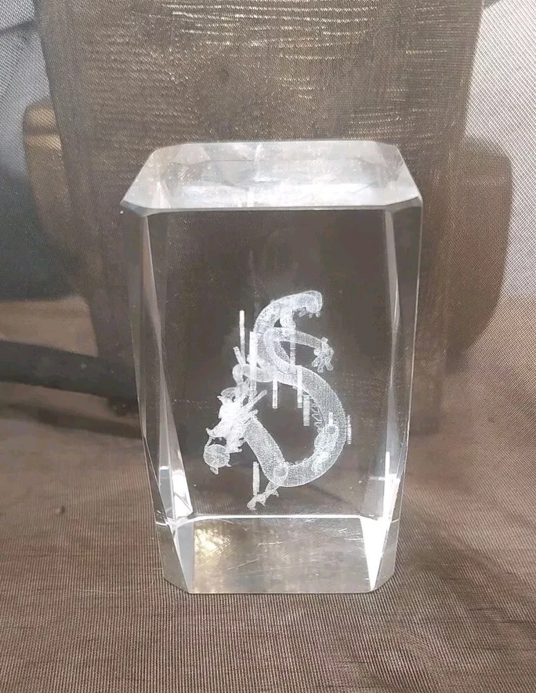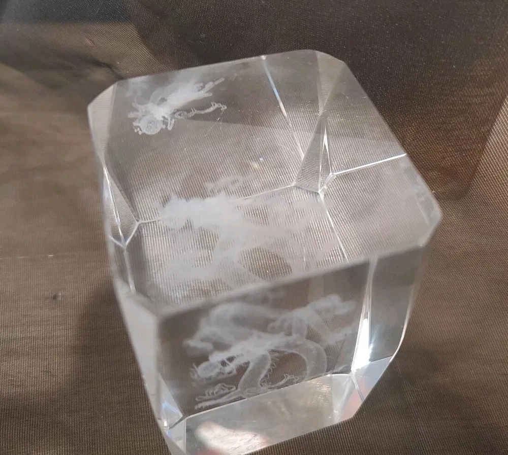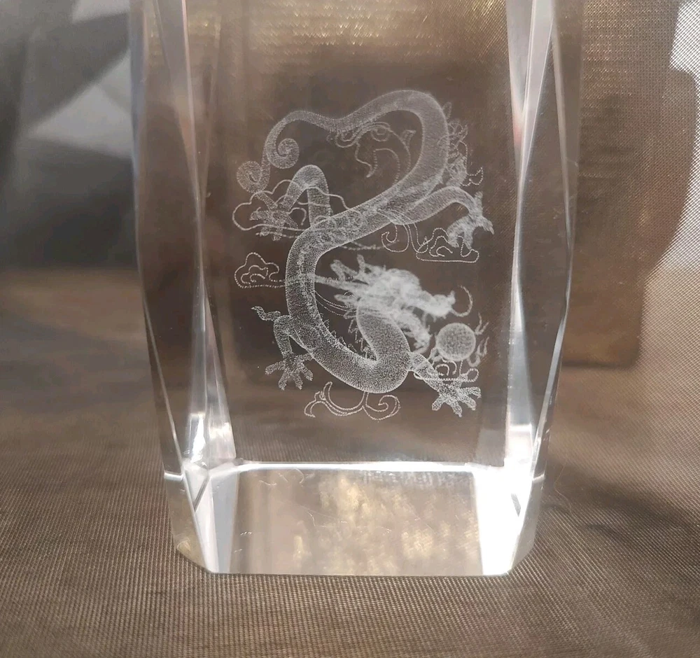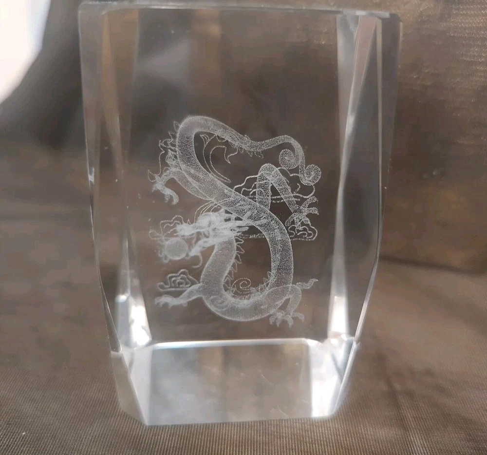 3-D Laser Etched Glass Crystal Paperweight Fire Breathing Dragon 3.2"x2" Medieval, Good Condition.