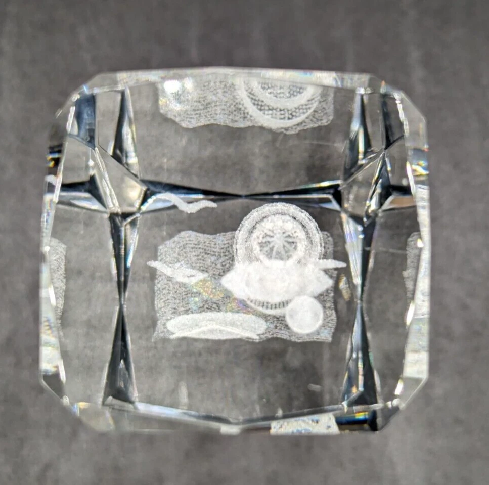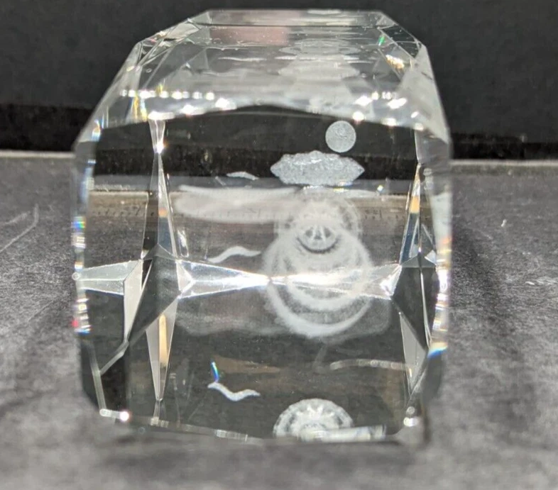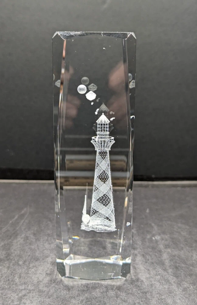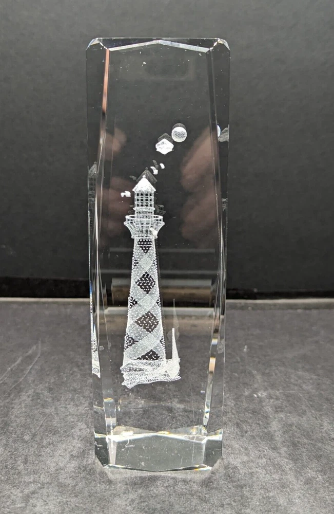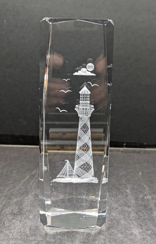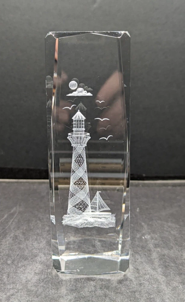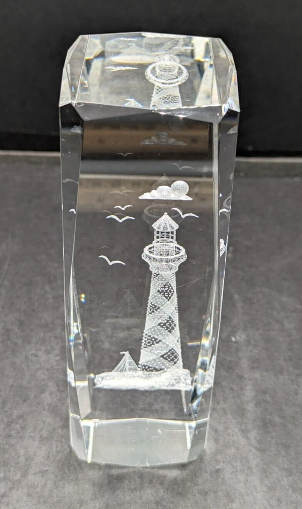 3D Laser Etched Prism Crystal Paperweight Lighthouse Sailboat Seabirds Clouds. No chips or cracks. The only issue are a few light scratches, barely noticeable. Please see the photos. This paperweight is heavy and about 6 inches tall and 2 inches in length and width. All of my items are carefully packed for shipping, no matter their value - $5 items are wrapped with the same care as a $200 item. My goal is to have your purchase arrive safely. Large, heavy and fragile items are harder to use combined shipping with but just ask if you would like to purchase more than one item and I am more than happy to do so if feasible. Measurements are approximate or as close as I can get. Also, the color you see many not be the exact color depending on your computer or phone settings. Unpaid items will result in the buyer being blocked from further purchases. Please remit payment right away so we can get your item shipped out quickly.