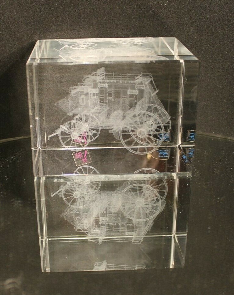 Up for Sale from "IMAGE 3 CRYSTAL" by "JAFFA" is a Solid Block of Crystal that has an inner image of a "STAGE COACH"---Done by a space age process.----A true 3-Dimensional image.(See Pictures)---Breathtaking!!! Will be coming to you with the Original Decals still attached(See Picture #3)--A very busy picture---The Blue Decal to the left reads as follows: CRAFTED IN THE U.S.A. IMAGE 3 CRYSTAL by JAFFA US PATENT NO. 5,206,496 The Maroon Decal to the right reads as follows: US PATENT NO 5,206,496---5,637,244 A True 3-Dimensional image has been created within a solid pc of Crystal. Through a space age laser process. The sophisticated process produces this inner image without blemishing the surface of the crystal. The amazing designs are suspended in time & space encased in flawlessly polished solid Crystal. This beauty measures 4-5/16 " Long(See Picture #1) by 3-1/8" High and weighs in at a Hefty---almost 4 LBS. Will be coming to you in "LIKE-NEW"--Pre-Owned Condition. Nice Clean Piece--Blemish Free--.(See Pictures) There are 8 Close-Up pictures for you to get a good look at what you are bidding on. PAY PAL, FOR IMMEDIATE SHIPMENT. WE SHIP INSURED PRIORITY, FIRST CLASS, AND MEDIA USPS MAIL WITH DELIVERY CONFIRMATION RECEIPT. WE SHIP FIRST CLASS INTERNATIONAL MAIL USPS with NO INSURANCE. WE SHIP PRIORITY MAIL INTERNATIONAL WITH INSURANCE and GLOBAL USPS ONLY! The postage for this item is $10,20 in the continental U.S.A. Other than U.S.A., e-mail for shipping rates. MINNESOTA RESIDENTS ADD 7.525% SALES TAX There is a 30 day return policy for a full refund, excluding Postage. If you are not satisfied with your purchase, please notify by e-mail that you will be returning an item. GOOD LUCK BIDDING!!!!! AS ALWAYS YOUR SATISFACTION IS A MUST!!!!!!!!!!!!!!