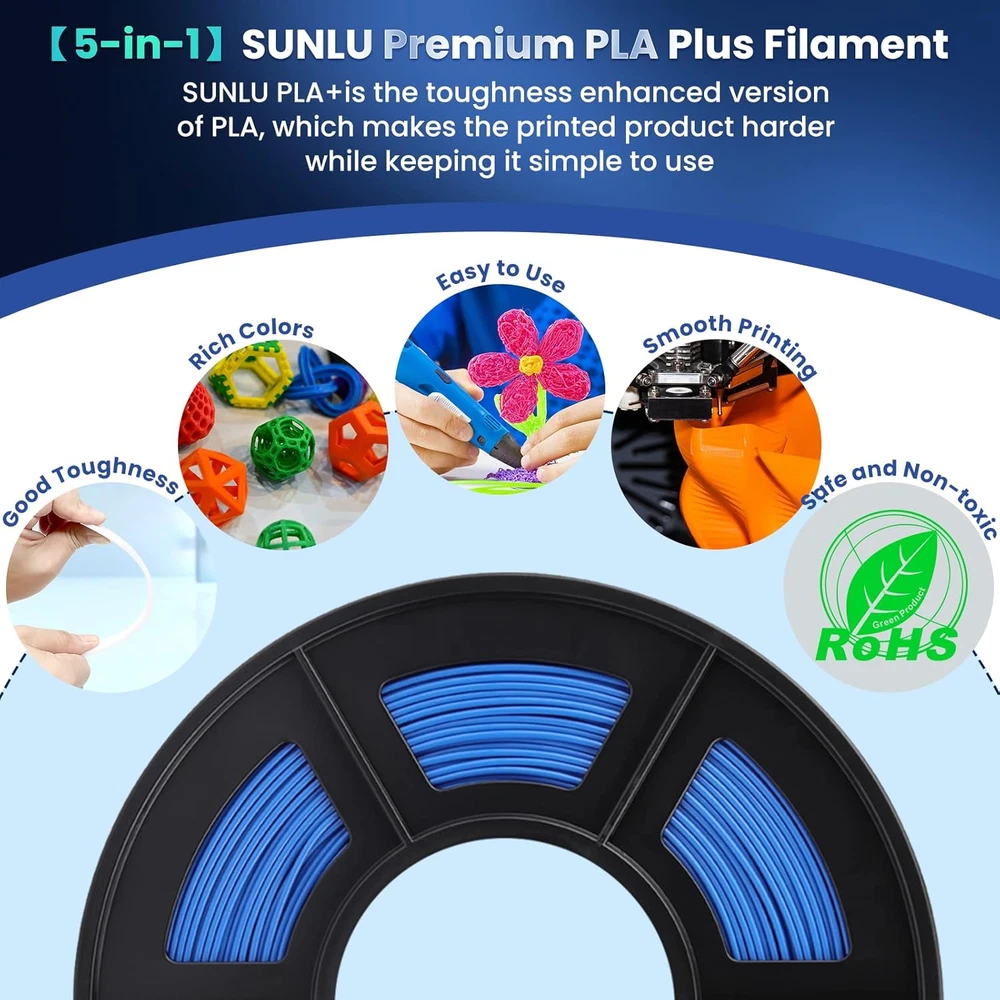 SUNLU 100% Neatly Wound PLA+ Filament The SUNLU R&D team has developed cutting-edge technology to produce 100% neatly wound PLA+ filament, an achievement unmatched by other brands. This advanced winding process ensures no knots or tangles, greatly enhancing printing efficiency and reducing downtime. Advantages of SUNLU PLA+ 3D Filament SUNLU PLA+ is 10 times stronger than standard PLA filament, offering improved durability and brighter colors. It is designed for hassle-free printing, with no clogs, bubbles, tangling, warping, or stringing. Its superior layer adhesion ensures better print quality, making it easy to use for both beginners and professionals alike. 1.75mm Diameter with High Dimensional Accuracy Engineered with precise dimensional accuracy of +/- 0.02mm, SUNLU filament is highly compatible with most 1.75mm FDM 3D printers. Its consistent diameter ensures smooth and reliable feeding for more accurate prints. Spool Specifications Diameter: 8.00 inches Width: 2.50 inches Hub Hole Diameter: 2.20 inches The spool's dimensions are optimized to fit most 3D printers, allowing for easy integration into your setup. Recommended Print Settings Nozzle/Extrusion Temperature: 210°C - 235°C (410°F - 455°F) Bed/Platform Temperature: 55°C - 65°C (131°F - 149°F) These settings help achieve optimal printing performance and quality. Wide Compatibility SUNLU 3D filament is not only compatible with all SUNLU 3D printing products, including FDM 3D printers and filament dryers, but also works seamlessly with a wide range of other FDM 3D printers, such as the popular Ender 3 and Ender 3V2 models. Product Description SUNLU PLA+ 3D Printer Filament - A high-strength, easy-to-use filament, perfect for beginners and professionals seeking high-quality, reliable prints. The video showcases the product in use. The video guides you through product setup. The video compares multiple products. The video shows the product being unpacked.