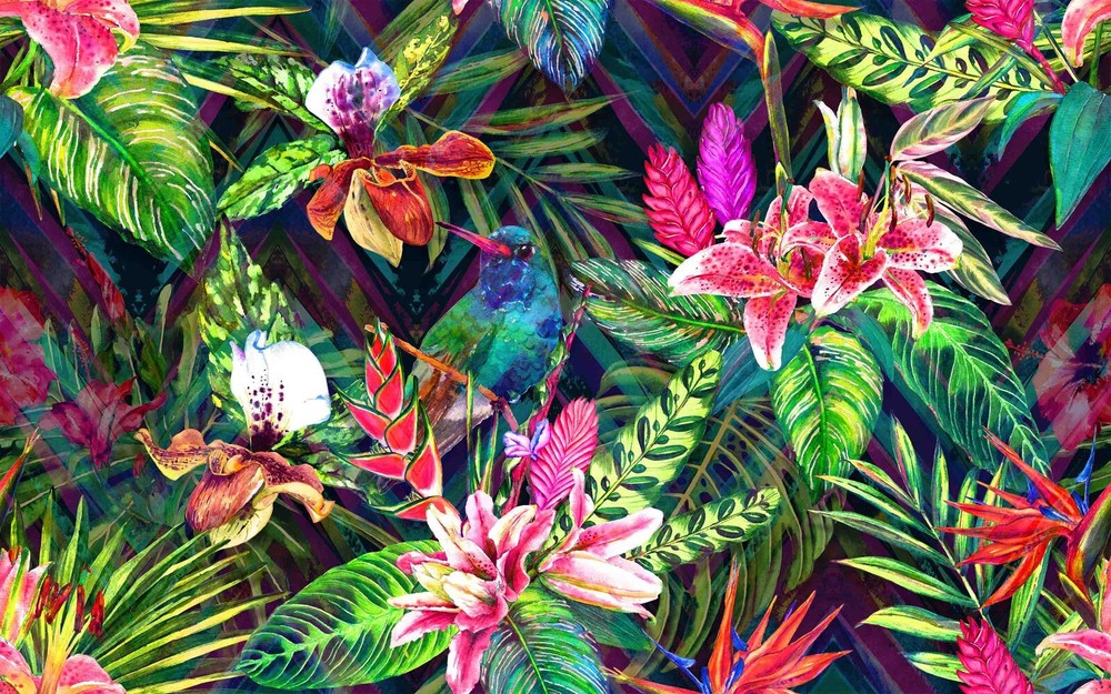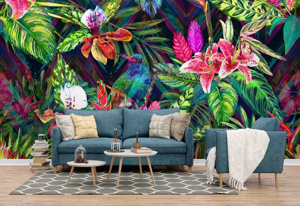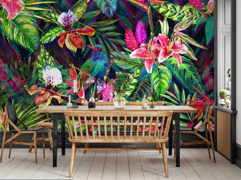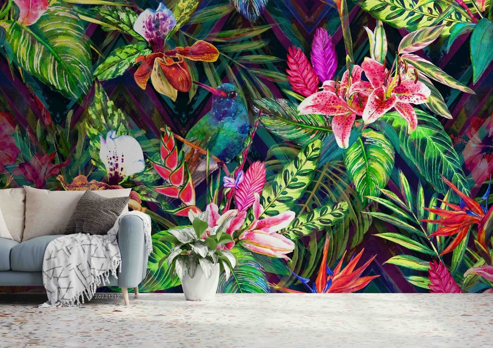 3D Tropical Pink Floral Green Leaves Wall Murals Wallpaper Murals Wall Sticker