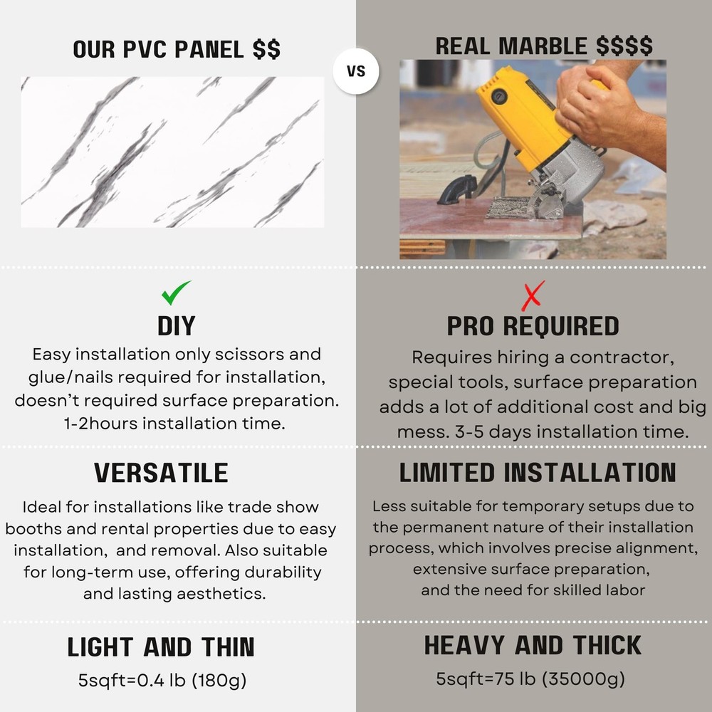 Effortless Elegance with Marble Peel and Stick Wall Panels Upgrade your space instantly with our 3D Marble Peel and Stick Wall Panels, the easiest way to achieve a sleek, modern look without the cost or hassle of real marble. Whether you’re enhancing your kitchen backsplash, shower walls, bathroom, living room, or even flooring, these lightweight, easy-to-install panels deliver a refined, high-end aesthetic in minutes. Each panel measures 24x12 inches (60x30.5 cm), allowing you to cover large areas quickly while maintaining a seamless, polished appearance. Designed to mimic the beauty of genuine marble, these panels offer a stunning 3D effect, adding depth and sophistication to any room. The best part? You get the elegant look of marble at a fraction of the cost, making this a smart, stylish solution for any home improvement project. Crafted from high-quality, durable vinyl, our panels are waterproof, stain-resistant, and easy to maintain—perfect for moisture-prone areas like bathrooms and kitchens. While they don’t have the weight or thickness of real stone, they provide a similar visual impact, creating a sleek, contemporary upgrade without the need for heavy materials or professional installation. For added durability in wet areas, we recommend sealing the edges with a waterproof sealant. Installation is quick and hassle-free—simply peel, stick, and admire. These panels adhere securely to clean, dry, and smooth surfaces, making them an ideal DIY-friendly solution. Whether you're revamping a backsplash, accent wall, or flooring, you can achieve a luxurious new look in just minutes. (For best results, avoid applying on rough, oily, or uneven surfaces.) If you’re looking for an affordable way to bring timeless marble elegance into your home, our 3D Marble Peel and Stick Wall Panels are the perfect choice. Easy to install, beautiful to look at, and designed to make a statement—your home transformation starts here. Affordable Marble Look for Any Space: Get the high-end appearance of marble—without the weight, cost, or hassle of real stone! Our peel and stick marble wall panels are a lightweight, budget-friendly alternative designed to replicate the sleek and stylish look of marble at a fraction of the price. Each panel measures 24x12 inches (60x30.5 cm) and is perfect for bathrooms, showers, kitchens, living rooms, and accent walls. Thin, Flexible & Easy to Work With: Unlike real marble or heavy wall panels, these thin, flexible panels are easy to cut and install, making them perfect for quick home upgrades. While they don’t have the thickness or weight of solid stone, they deliver a similar visual effect, allowing you to transform your space without complex installation or high costs. Waterproof & Practical for Everyday Use: Made from moisture-resistant materials, these panels are waterproof and stain-resistant, making them a great choice for bathrooms, showers, and kitchen backsplashes. While they mimic the look of marble, they offer a practical, low-maintenance alternative that won’t absorb water or require sealing like real stone. For extra durability in wet areas, we recommend sealing the edges. Effortless DIY Installation: Skip expensive labor and complicated tools! These self-adhesive panels stick securely to clean, dry, and even surfaces, making installation quick and hassle-free. Whether you're updating a backsplash, bathroom wall, or decorative feature, you can achieve a stylish upgrade in minutes. (Avoid applying on rough, oily, or uneven surfaces for the best results.) A Smart & Budget-Friendly Choice: If you love the look of marble but need a more affordable, lightweight option, these thin peel and stick panels are the ideal solution. Whether you’re working on a small home update or a larger decorative project, this is the easiest way to achieve a modern, stylish look—without the cost or effort of real stone.