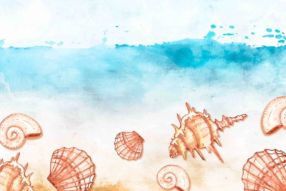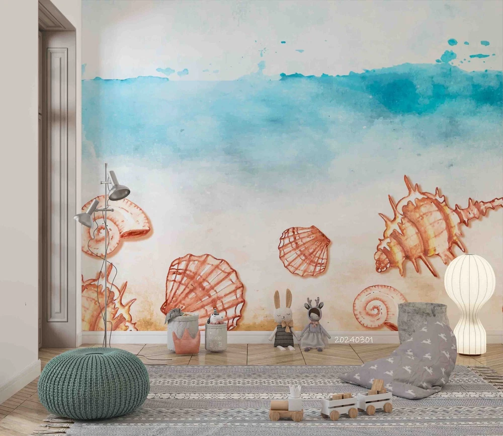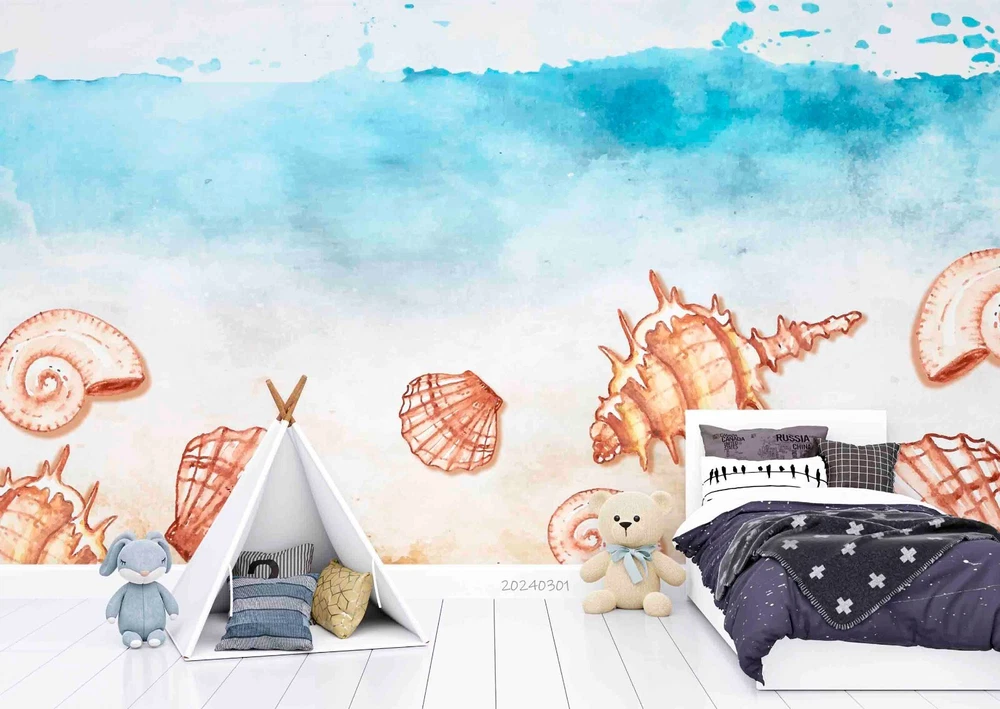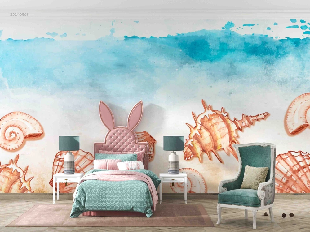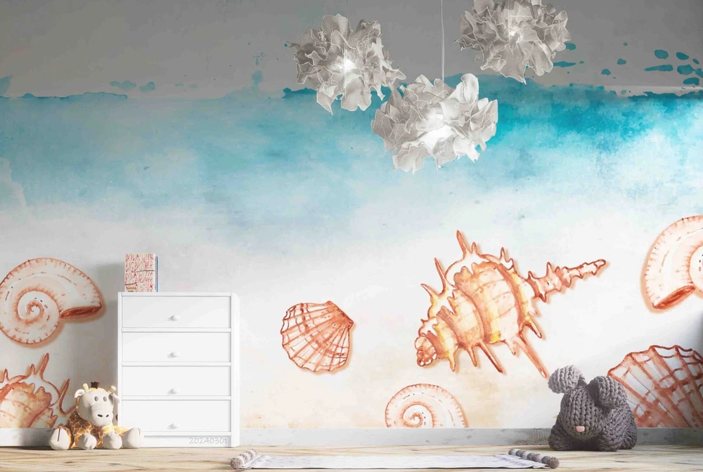 3D Watercolor Sea Shell Conch Blue Wall Murals Wallpaper Murals Wall Sticker