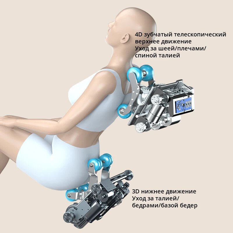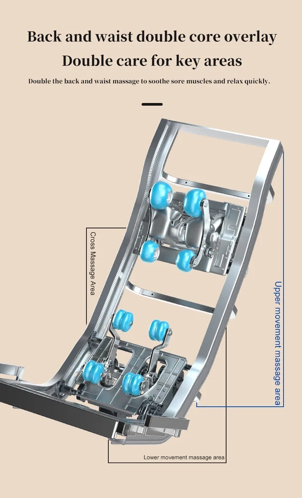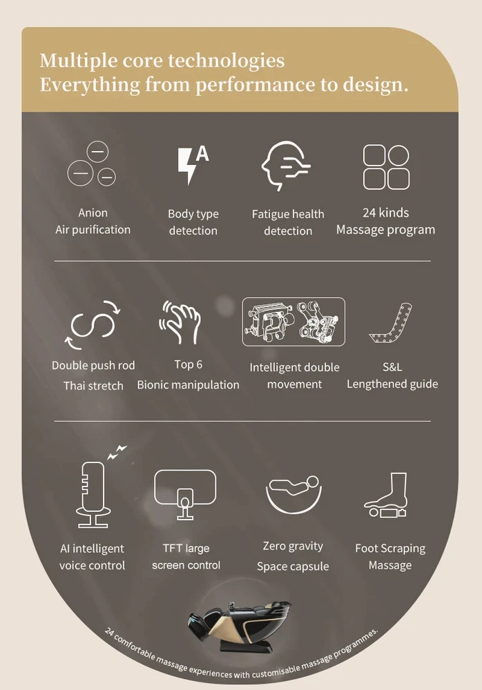Further Comfort Massage Multiple Core Technologies *Anion- Air purification *Body type detection *Fatigue health detection *24 kinds massage program *Double push rod-Thai stretch *Top 6 Bionic manipulation *Intelligent double movement *S&L lengthened guide *AI intelligent voice control *TFT large screen control *Zero gravity-space capsule *Foot scraping massage Intelligent dual core, synchronised massage Upper movement 4D tooth motive movement + lower movement 3D large movement as two masseurs two hands at the same time massage efficiency is more than 1 + 1, soothe all day fatigue. Double care for key areas Double the back and waist massage to soothe sore muscles and relax quickly. Head-to-toe stress relief Extended SL rail, seven-section massage, corresponding to 24 sets of massage programmes music and soothing modes and 6 major massage techniques, from head to leg are carefully taken care of. 6 Massage Techniques *Knocking *Massage *Chiropractic *Tap *Knead *Torture Full body airbag wrap massage The air valve independently controls the shoulder/ waist/ arm/ hip/ leg/ foot airbags, which can quickly pressu rise and release the pressure at the same time, to achieve a strong massage to relax the whole body. Heated lumbar area with massage The lumbar part can be opened to warm up, with the full wrap design of airbag can better lock the heat in the whole body flow, massage experience iss better Multiple knee/ leg/ foot treatments *Thiah center---Intermediate airbag rubbing *Leg side---The air ags swing from side to side *Leg bellies---Knead two sets of rollers *Pericrural---Foot airbag pinch *Sole of foot---3 rows of roller top kneading scraping Intelligent electric induction retractable To calf sensing automatic expansion 12cm, height 150-200CM applicable. Calves can be placed comfortably. Multiple Control Modes *Intelligent voice control *Touch screen control *Shortcut key control Negative Oxygen Ion Purifcation Efcient negative oxvgen ion purifcation function, as if in the arms of the forest breath, negative oxygen ion purifcation air. Bring more care and health to the family. Configure six music modes *Stress relief and sleep aid *Purify the mind *Calm and soothe *Positive energy in the morning *Warm encouragement *Heal the mind Smart Health Monitoring Multidimensional perception of body state. Smart sensors automatically detect health indicators such as heart rate, blood oxygen, blood pressure, fatigue index, etc., understand you, and then customize your massage mode. Zero gravity foating relaxation experience Simulate zero gravity elevation angle of space craft Short distance against the wall Significantly improved space utilization Luxury, Elegant, Hongmei Style *Full body piano paint baking process Dynamic lines of coupe running Adapt to various decoration styles *High grade PU leather for massage chairs Skin friendly and wear-resistant, with excellent durability *Romantic atmosphere lamp Light up the night and enjoy tranquility Built in with wireless charging USB port charging Product size parameters Movement: 4D toothed upper movement + 3D lower movement large machine Rail travel: SL rail Color: White Gold/ Black Gold Massage technigues: 6 types of massage techniques Body type detection: Al intelligent detection Sound confiquration: HlFl Bluetooth sound system Hot compress temperature: ≈ 45 °C Hot compress area: waist Rated voltage: 220V Supported charging: wireless charging+UsB charging Massage areas: Neck, Shoulders, Waist, Buttocks, Arms, Feet, Soles of feet Control mode: touch screen / Al voice control / shortcut button control G.W/N.W:116KG/104KG Product size: upright size: 160x77*125cm lying flat size: 184x77*83cm