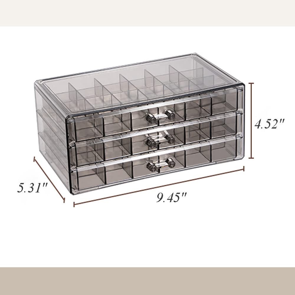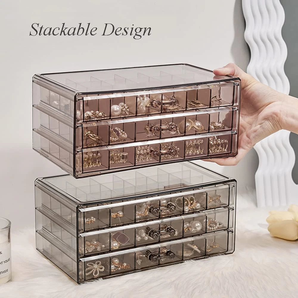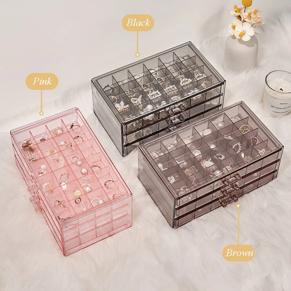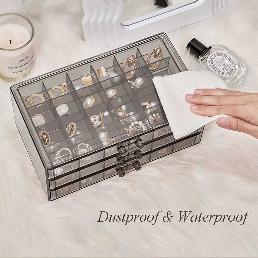 Clear Jewelry Box: Jewelry box is made of clear material, keeps your ring and earring organized in separate space and displayed 3 Layer Drawers: Removable and clear drawers design makes it easy to find your items, you can take earrings you need easily by pull out the drawers Large Capacity: This acrylic earring storage box has 3 drawers with 72 grids, total Size 8.5 x 5.5 x 3.5 inches, each compartments size 1.26 x 1.26 inches Dustproof Jewelry Organizer: Jewelry box with lid keeps your jewelry free from dust and tangles, you can clean the box can just with a damp cloth Awesome Gift: Fits most small size jewelry, earring, necklaces, rings and it will be an excellent addition on your dresser