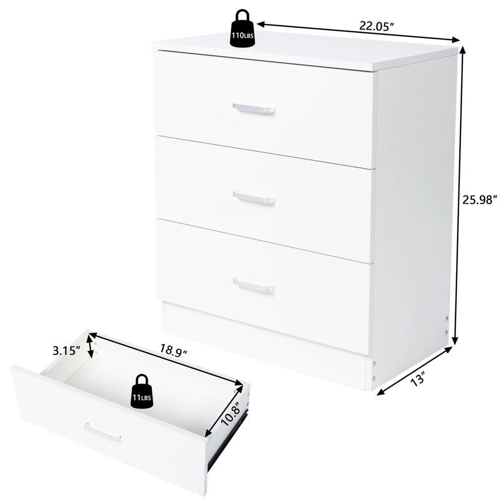 Department: Adults Assembly Required: Yes Additional Parts Required: No Item Height: 25.98 in Type: Chest of Drawers Number of Drawers: 3 Pcs Mounting: Free Standing Item Length: 22 in Material: MDF Wood Room: Bedroom, Living Room MPN: Does Not Apply Item Width: 13 in UPC: Does not apply Style: Contemporary Handle Type: Level Handle Handle Finish: Stainless Steel Brand: FCH Color: White Dimensions: (25.98 x 13 x 22.05)"(L x W x H) gtin13: Does not apply
