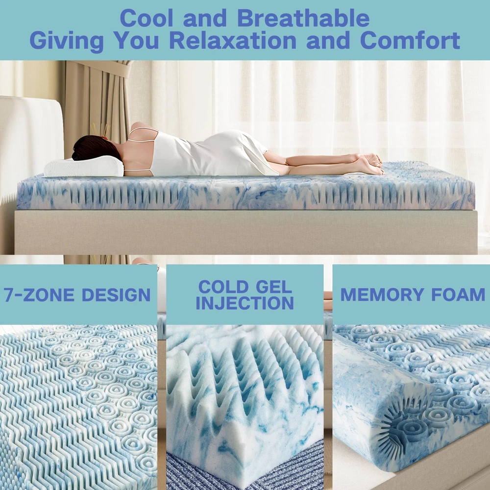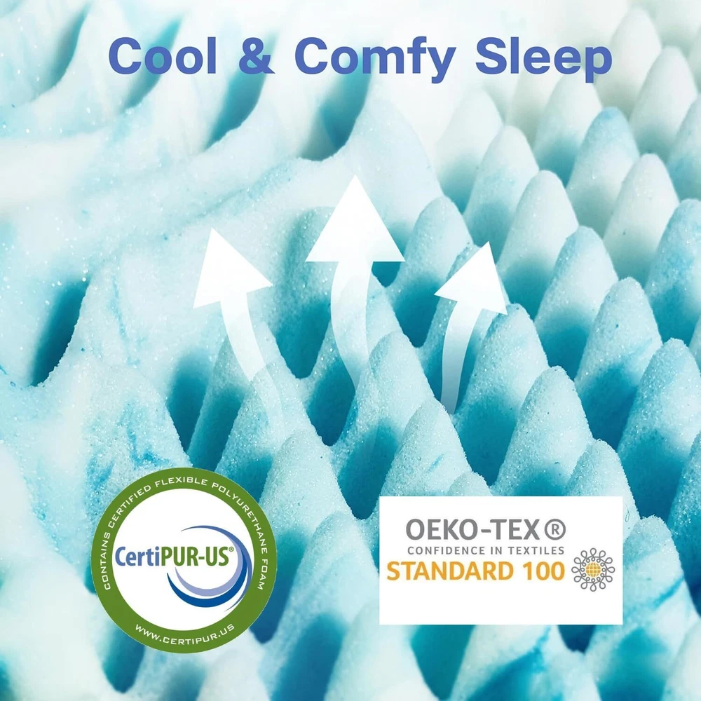 COMFORTABLE SLEEP:upgraded full size memory foam mattress topper, crafted from premium slow-rebound memory foam, offers comfort and support. As you lay down, the mattress topper full gently wraps around your body and slowly sinks until achieve the perfect balance between gravity and support. Its features effectively alleviate muscle tension and bone discomfort for faster falling asleep and sounder sleep. 7-ZONE TARGETED SUPPORT:Our memory foam mattress topper provides targeted support in 7 zones for the head, shoulders, back, waist, hips, knees, and feet. Whether you sleep on your side, back, or stomach, the full mattress topper gives personalized comfort. The memory foam mattress full always helps reduce pressure point pain and discomfort during sleep. BREATHABLE INFUSED:Our cooling mattress topper offers superior breathability and coolness through strategically placed airflow channels and infused cooling . The high-density distribution of particles swiftly absorbs and disperses body heat, creating a dry, enjoy optimal temperature regulation without sweating or discomfort for a consistently refreshing sleep environment. MORE RELIABLE CHOICE FOR FAMILIES: This full cooling mattress topper prides prestigious certifications from CertiPUR-US, amfori BSCI, and OEKO-TEX, guaranteeing the use of exclusively safe and environmentally friendly materials. It forms a sturdy shield to protect the of your skin and your family. This bed toppers full size not only fosters a restful sleep but also prioritizes the , safety, and overall well-being of you and your loved ones. MATTRESS IN A BOX: Unpacking our 3-inch memory foam mattress topper is simple. Carefully cut open the vacuum-sealed bag, unroll the mattress topper, then allow 24–48 hours for full expansion - making it easy to enhance comfort or rejuvenate any mattress in your home.