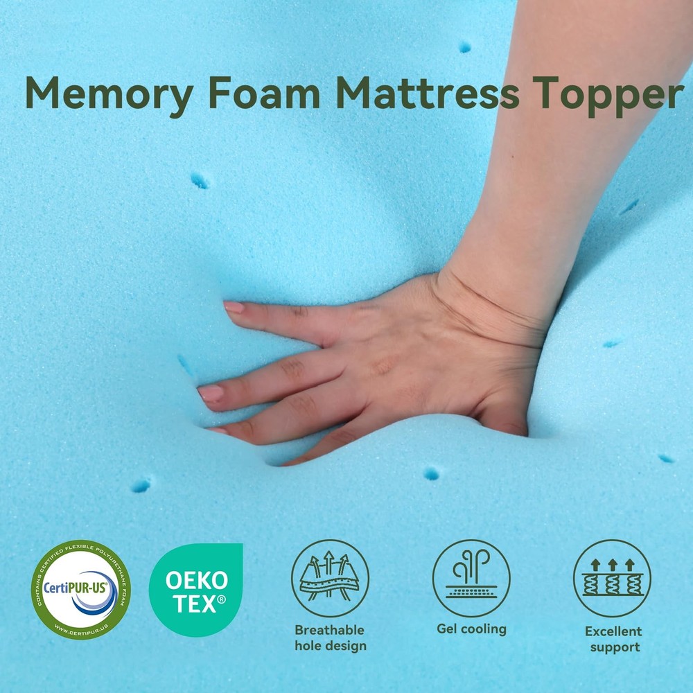 Elevate your sleep quality with our 3-inch king mattress topper with cover. Enhance your sleep experience with this 3-inch mattress topper with a cover, designed to offer exceptional comfort and sustainability. This memory foam mattress topper combines softness and durability. Known for its breathability and moisture-wicking properties, 30% medium molecular PE creates a cool and comfortable sleeping environment all night long. This mattress topper features high-density memory foam that precisely conforms to your body's contours, offering exceptional support and comfort. The memory foam effectively distributes body weight evenly, alleviating pressure points and ensuring you enjoy deep, restful sleep every night. The included cover is made from breathable materials, which further enhances the comfort of the topper. It is removable and easy to clean, ensuring that your mattress topper stays fresh and hygienic. Available in a variety of sizes, including twin, twin XL, full, queen, and king, this mattress topper meets the needs of diverse households and individuals. Compressed and packaged for your convenience, this topper is easy to transport and set up. Choose this mattress topper to enjoy peaceful and comfortable nights while experiencing the exceptional comfort . [CertiPUR-US Certified] - Transform your sleep sanctuary with our 3-inch king memory foam mattress Topper – certified by CertiPUR US and Oeko-Tex Standard 100 for unrivaled safety and durability. The king mattress topper is made of premium and safe material with no harmful substances, skin-friendly and safe for all people, including pregnant and kids. Unbox a healthy and blissful sleep experience! [Premium King Mattress Topper] - The infusion of cooling gel, combined with aviation grade ventilation holes, allowing for heat capture and dissipation to ensure your sleep comfortably cool. Additionally, The high-density king memory foam mattress topper contours to your body shape, providing comfort support for your spine, alleviating joint pain and preventing sinking into the foam. The king mattress topper cover features 35% elastic and breathable Bamboo fibers that are static-resistant and skin-friendly, creating a healthy and comfortable sleep environment for you [Anti-Slip & Washable Topper Cover] - Our 3 in king mattress topper enhanced by specially designed adjustment strap for mattress up to 14" deep and anti-slip silicone points, which ensure a secure fit for the mattress. The L-shaped zipper closure allows for easy removal and washing, providing a layer of environment-friendly and elegant protection for your mattress [Soft Your Mattress] - The 3-inch king mattress topper softens the discomfort of an old bed, offering a cost-effective solution for extending the lifespan of your mattress. Featuring high density memory foam, king mattress topper provides a perfect balance of softness and support for a cloud-like sleep experience. Easily attach the topper to the mattress in your bedroom, guest room, RV, or college dorm [Usage Instructions] - The king mattress topper is vacuum packed for convenient delivery. Before use, please unzip the cover and wait for the mattress to expand for 48 hours. Any questions and suggestions, please feel free to tell our after-sales team, we will provide you with solutions within 24H! All toppers come with a 30-day full money-back guarantee and are supported by our 3-year warranty against manufacturing defects, you can trust in the quality and durability of the product