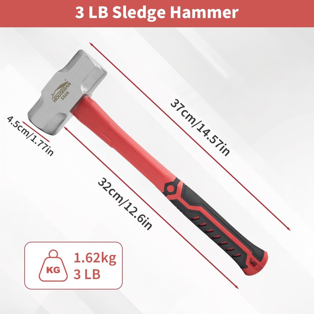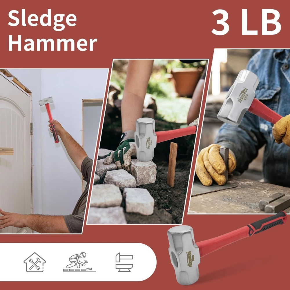 This 3lb sledgehammer features a unique octagonal head design that enhances accuracy and stability, preventing slipping during heavy-duty tasks. Made from high-strength forged steel, it offers excellent impact and wear resistance for reliable performance under tough conditions. The hammerhead is securely bonded to the handle using advanced injection molding, ensuring long-lasting durability. The ergonomic handle reduces hand fatigue and improves control, making it perfect for extended use in construction or demolition. Versatile and durable, this sledgehammer is ideal for construction, demolition, woodworking, and repairs, making it a must-have tool for both DIY projects and professional craftsmen. Octagonal Head Design:The 3lb sledge hammer features a unique octagonal head, enhancing accuracy and stability to prevent slipping or veering off-target during heavy-duty tasks. Durable Forged Steel:Crafted from high-strength forged steel, this sledgehammer offers excellent impact and wear resistance, ensuring reliable performance under tough conditions. Advanced Bonding Technology:With advanced injection molding, the hammerhead is securely bonded to the handle, preventing loosening and ensuring long-lasting durability. Comfortable Handle:The ergonomic handle design reduces hand fatigue, provides a secure grip, and improves control, making it ideal for extended use in construction or demolition. Versatile for Multiple Applications:Perfect for construction, demolition, woodworking, and repairs, this 3lb sledgehammer is a reliable tool for both DIY and professional tasks.