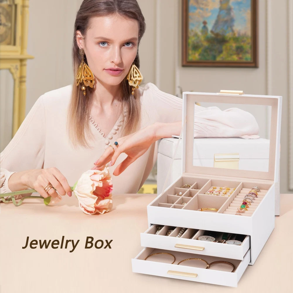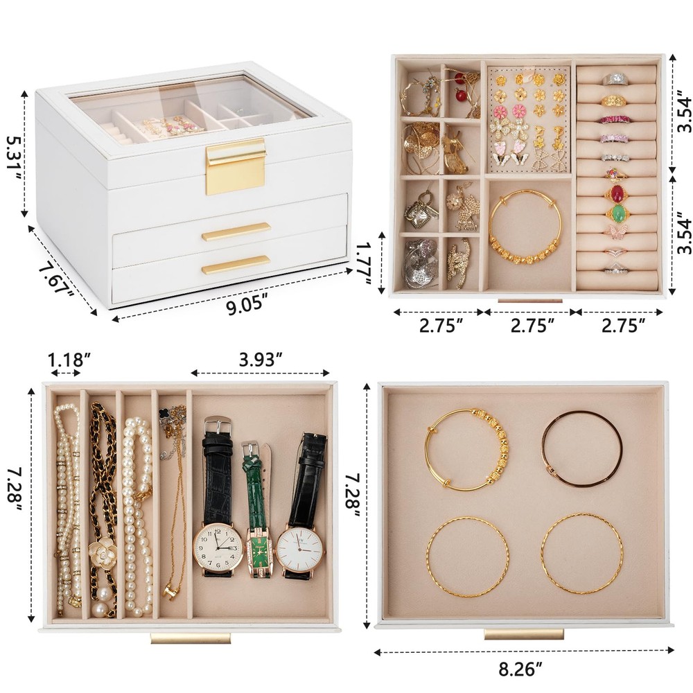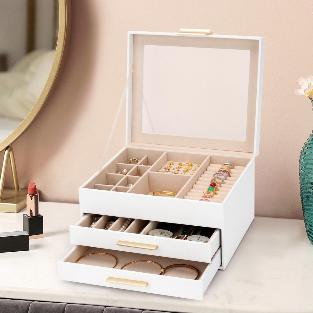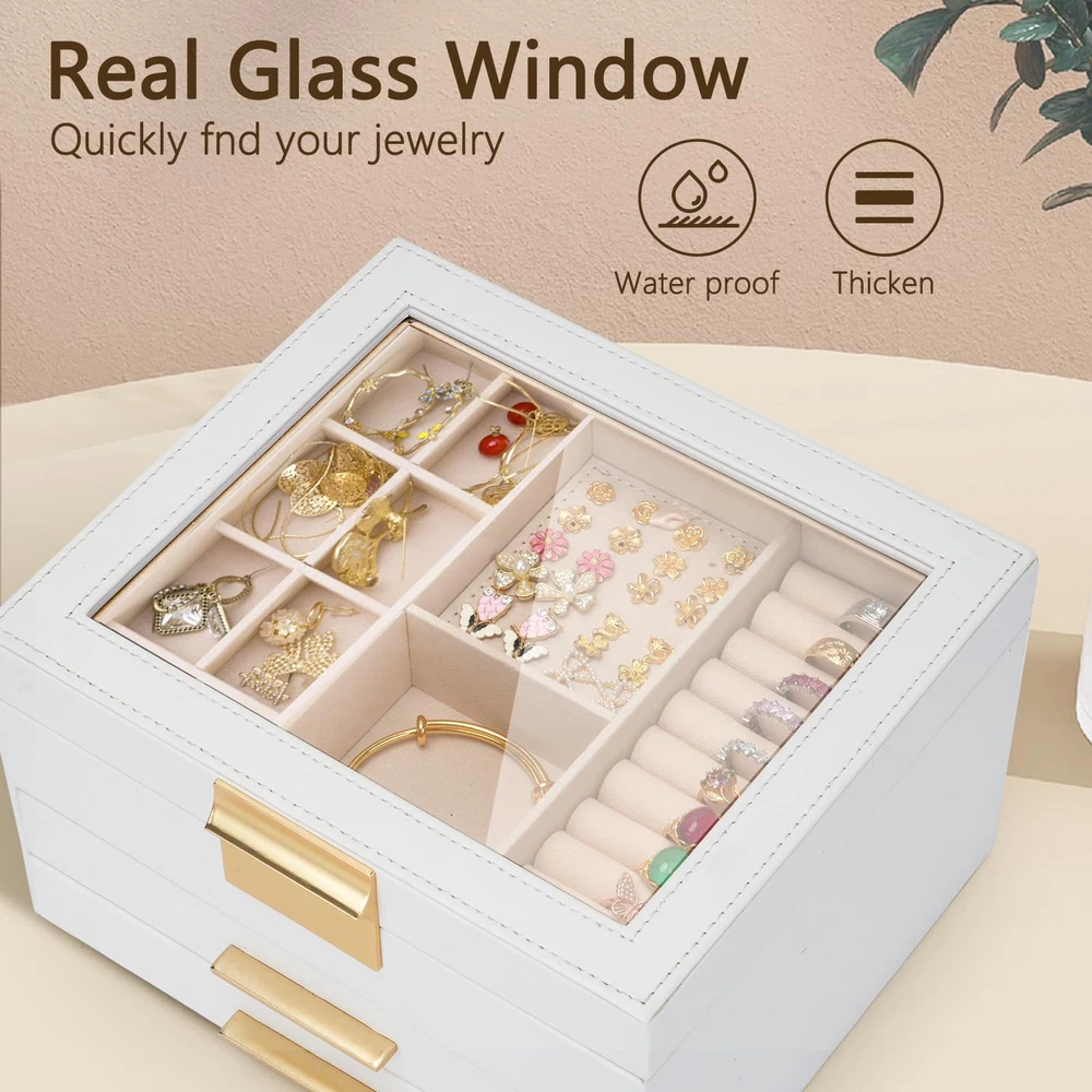 【Large Clear Lid for Easy Access】 – Showcase your favorite pieces under the clear glass lid of this jewelry organizer for women, making it effortless to find your treasures at a glance. This 3-layer jewelry box features three spacious drawers, multiple compartments, and elegant gold hardware for smooth access. 【Durable Material & Elegant Design】 – Crafted with premium PU leather, a soft velvet lining, and a flannel interior, this womens jewelry box is as durable as it is stylish. It’s shockproof and pressure-resistant, ensuring your valuable pieces stay safe. DIMENSIONS: 9.05" x 7.67" x 5.31". 【Versatile Jewelry Storage Solution】 – Perfect for organizing all your accessories, this jewelry box for women fits seamlessly on your bedroom dresser or closet shelf. Whether you need jewelry boxes & organizers for necklaces, earrings, or bracelets, this chic jewelry storage solution handles it all. 【Thoughtfully Designed Compartments】 – Rings fit snugly in the slots, earrings in small cubes, and necklaces in narrow compartments. With its practical layout, this jewlry box ensures every piece has its place, keeping everything tidy and easy to find. 【Perfect Gift for Any Occasion】 – This jewlery box is the ideal gift for women, from mothers to daughters and wives. With its modern design and included gift card, it’s ready to impress for birthdays, anniversaries, or any celebration.