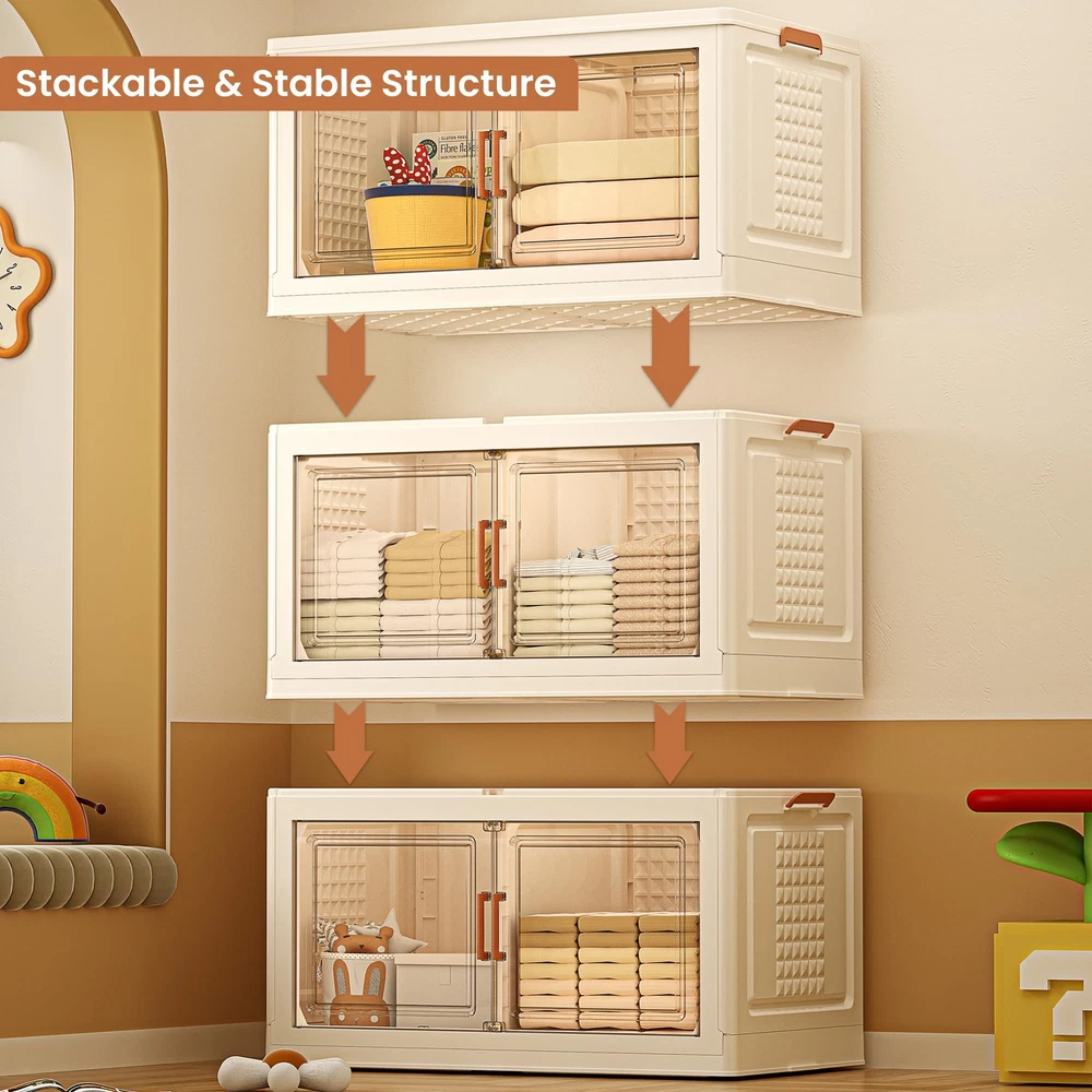 Big-MAC bins are made from polypropylene plastic (PP) with 33.46 x 18.89 x 18.89 dimensions. These lids accumulate 47 gallons of space which can be used for storing clothes, towels, books, shoes, toys, stationery, glass, food items, etc. Also, these bins can be useful for sustaining pressure of 50 lbs. and direct force to keep the items safe from harm. Still the bins are very light-weight and can be carried with hands particularly when they are empty. You can easily move it around the available space through its 360 wheels which can be attached and removed as per the need. Moreover, since the bins can be stacked in the form of layers to achieve the intended experience, usage, and available space, these can be stacked in the required format. Moreover, these bins are collapsible and expandable. These can be easily expanded and folded as per the need. When you do not need to use them fold and store them under the bed, stairs, or any other location for safekeeping without worrying. These are easy to carry due to the foldable handles on both sides. While on the front the magnetic closure double doors keep the bins and the items placed inside safe. [๐ฆ๐๐ถ๐๐ฎ๐ฏ๐น๐ฒ ๐ณ๐ผ๐ฟ ๐๐ป๐ฑ๐ผ๐ผ๐ฟ๐/๐ข๐๐๐ฑ๐ผ๐ผ๐ฟ๐] Collapsible storage bins are perfect for organizing indoor spaces like bedrooms, kitchens, and living rooms, or outdoor areas like patios and garages. Suitable for both indoors and outdoors. [๐ ๐ผ๐๐ถ๐ผ๐ป-๐ฆ๐ฒ๐ป๐๐ผ๐ฟ ๐๐ถ๐ด๐ต๐๐ถ๐ป๐ด] Equipped with active sensor body lights for effortless visibility, even in low-light conditions. [๐๐ญ๐๐๐ค๐๐๐ฅ๐ & ๐๐ฑ๐ฉ๐๐ง๐๐๐๐ฅ๐ ๐๐๐ฌ๐ข๐ ๐ง] The bins can be stacked as layers one over the other for space management during usage. These are safe for stacking over one another and stay stable in the face of jerks. Stacking them can take the form of a wardrobe or bookcase for concerned roles. While the bins can be added with wheels which makes them move despite the weight of the 3 layers and items inside them. [๐ ๐จ๐ฅ๐๐๐๐ฅ๐ & ๐๐จ๐จ๐ฅ-๐๐๐ฌ๐ฌ ๐๐ง๐ฌ๐ญ๐๐ฅ๐ฅ๐๐ญ๐ข๐จ๐ง] These are good with storage as well as usage. The bins can be folded when idle to manage space. The foldable designs of these Big-MAC make it easier to fold them into flat panels just like expanding them. The same can be done when you need to use them. This takes very little amount of time for either of the both outcomes. [๐๐ก๐ ๐๐ง๐ฅ๐ฒ ๐๐ญ๐จ๐ซ๐๐ ๐ ๐๐๐๐ข๐ง๐๐ญ ๐๐จ๐ฎ'๐ฅ๐ฅ ๐๐ฏ๐๐ซ ๐๐๐๐ ๐๐จ ๐๐ฎ๐ฒ] Our stackable storage cabinet blends classic style with practical use. Made with great care and skill in the USA, it features excellent craftsmanship. Plus, it comes with a hassle-free return policy for your peace of mind.
