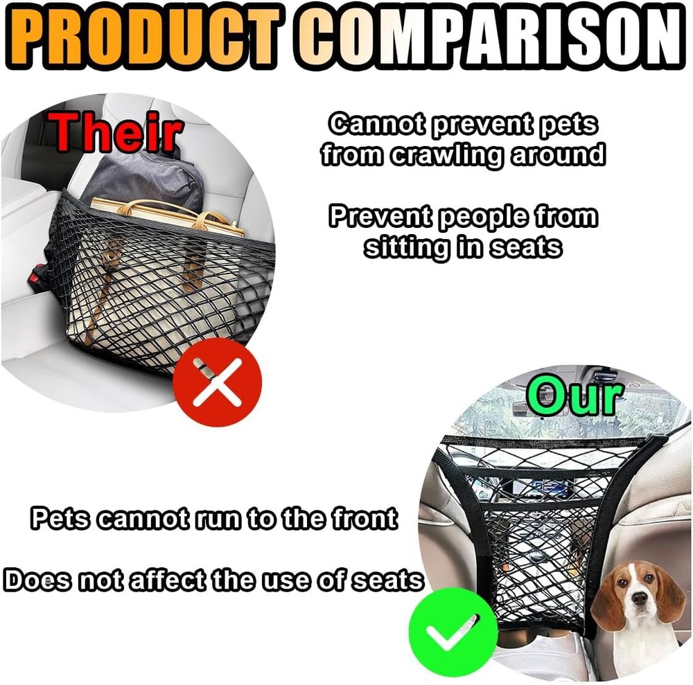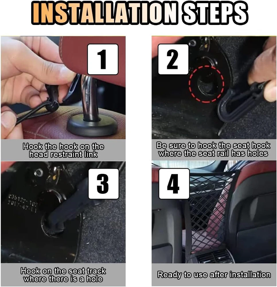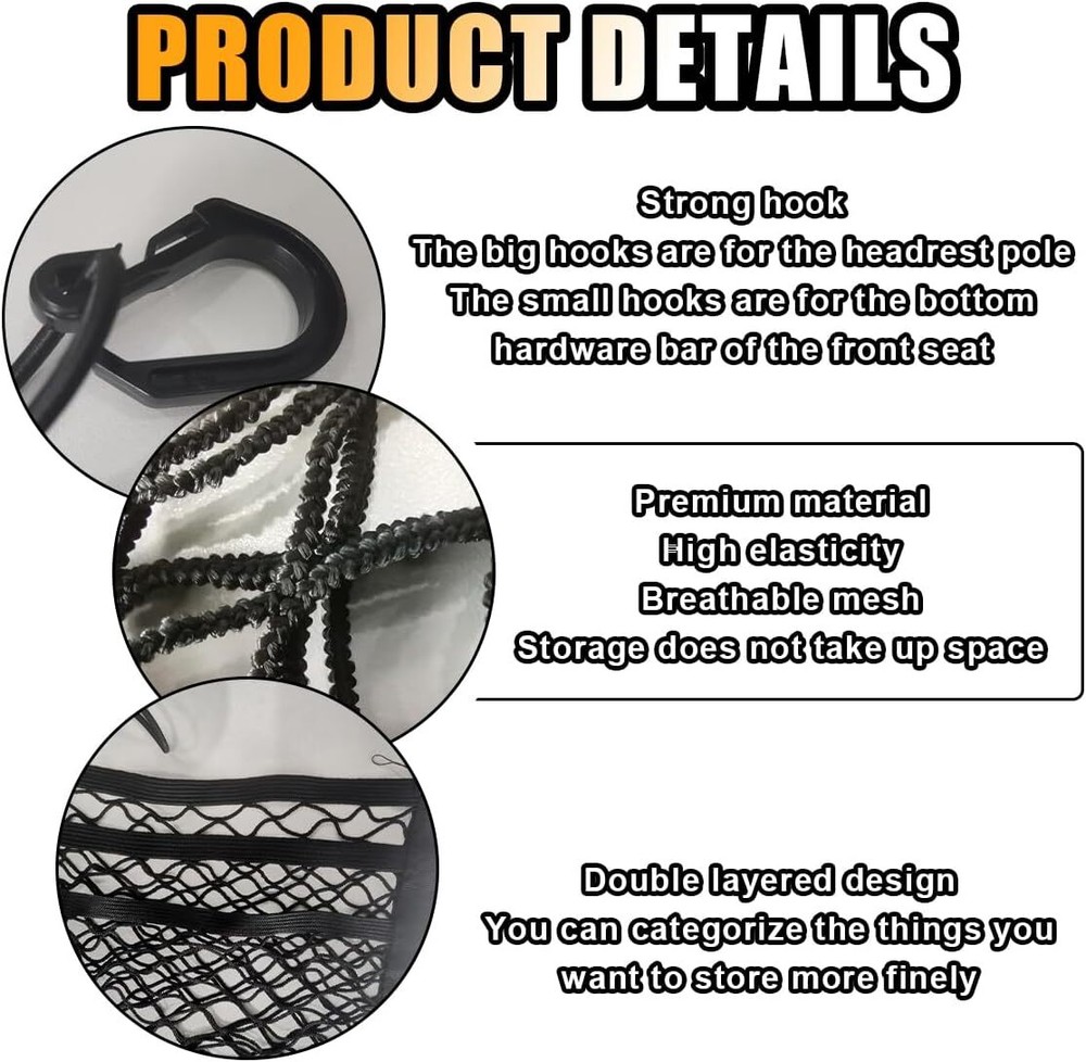 【Reliable Material】:The car backrest net bag is made of high-quality polypropylene fiber material, wear-resistant and dirt-resistant, the mesh surface is highly elastic and stretchable, pulling is not easy to deform, to meet your storage needs, can be used as a must-have item when you are traveling by car. 【Safe Driving】:The car mesh pocket can be used as a barrier between the front and back seats of your car to keep pets or children out of the back seat area, reducing their interference and protecting your driving safety. 【Easy to Install】:The car net organizer bag comes with four high-quality hooks, simply hang the four hooks on the appropriate positions on each side of the seat. Note: After installation, please check whether the fixing position is firm or not, so as not to fall off and cause damage. 【Widely Applications】:Fits most cars, trucks, SUVs and other vehicles with headrest bars. The car mesh pockets can hold most medium-sized items such as cell phones, wallets, rainwater, paper towels, etc. It is a great help for you to store and organize your items. Note: Not suitable for storing items larger, heavier or smaller than the mesh pockets. 【Size of Organizer】:Includes 1 car net organizer. Size is approximately 10.15×11.61 inches and stretches to 16.53×15.74 inches (with two pockets), which meets the needs of most cars. Note: Before purchasing, please make sure the length of the mesh bag matches your vehicle.