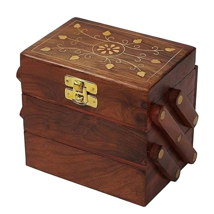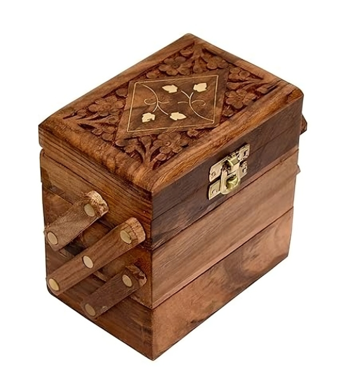 3-Layer Wooden Jewelry Box with Flip Flap Lid - Carved Keepsake Gift for Women
