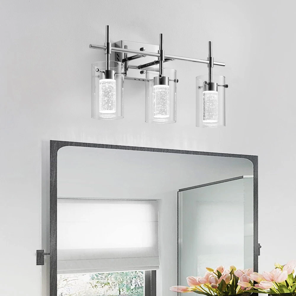 【DESIGN SIMPLICITY】This crystal vanity light featuring a sturdy metal body and a sleek clear glass shade.Encased in attractive clear glass cylinder maximizes light output for an optimally bright ambience. Perfect for bathroom or vanity lighting.The wall mount light design allows for this sconce to be installed in an upwards or downwards position. 【3 Color LED & Energy Saving】Our 21W LED bathroom light fixture requires no bulbs, A+ energy efficiency rating, save you 80% energy costThe perfect alternative to traditional light bulbs. More versatile is the choice of three colors of light: White / Natural / Warm, to meet your needs for warm and cool light. 【WIDE APPLICATION】The LED vanity light is applicable to the top of mirror, mirror, bathroom, dressering room, art exhibition, living room, corridor, study, stair, etc 【EASY TO INSTALL】Strong package, easy to install. There are instructions inside, according to which you can quickly install. Can be mounted in upward or downward orientation for your preferred style. 【PROFESSIONAL MANUFACTURER】30 years production experience, import to USA enterprises, now retail to consumers directly. Best quality-assuring, best service assuring, drop test, strong packing, just aim to provide perfect wall sconces to you.