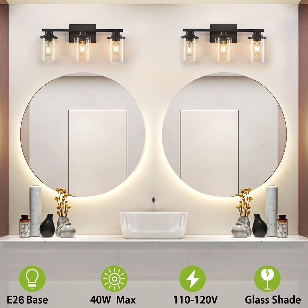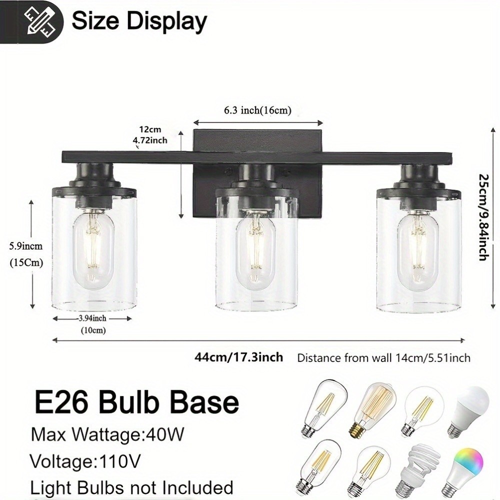 Enhance the aesthetics of your bathroom with the Maichixin 3-Light Vanity Light Fixture. The modern style is perfectly embodied in the sleek matte black base and the clear shade that provides a crisp, clean look, making it a versatile addition to any contemporary bathroom setting. Designed for indoor use, this fixture offers both functionality and elegance. It features a wall-mounted installation which ensures a neat and tidy appearance. The dimmable lights (Bulb Shape Code E26) allow you to adjust the brightness to your preference, creating the perfect ambiance for any activity in your bathroom.