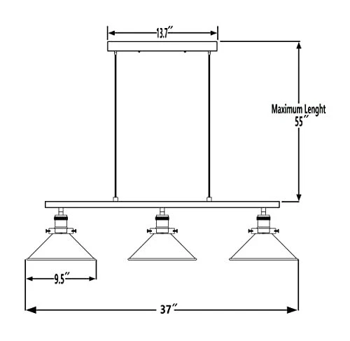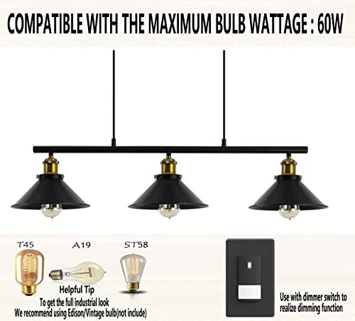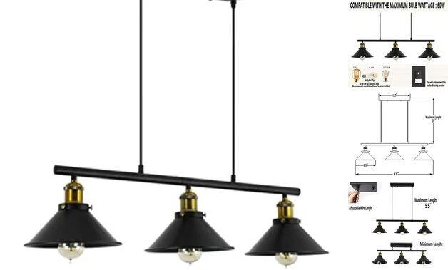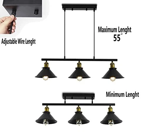 Return Policy Fast Delivery Trusted seller 3-Light Kitchen Island Pendant Light Fixture, Farmhouse Linear Hanging Lighting, Industrial Chandelier with Matt Black Finish for Kitchen, Bar, Dining Room, Pool Table Product Description Dimensions: Canopy 13.7"X4.3'', Lampshade Dia:10".Lamp body is 37" , adjustable hanging cord total length: 55". Adjustable Height and Easy Installed: This product is hardwired, installation is required. Well-package and Users’ manual and Additional accessories, ensuring your installation.Tips: Please make sure the same length of the wires at both sides before wiring, it will make the lamp even and not inclined. Dimmable: fully dimmable when used with a dimmable bulb and compatible dimmer switch.Bulb Type: Requires 3x E26 basebulbs(Max.60W). Bulb not included Durable Finish & Vintage Style: The vintage retro style pendant light with the elegant design creates a cozy and romantic atmosp. It can be used in Indoor Lighting including in Dining Room, Living Room, Kitchen, island, and billiard table. Quality Service: We providing free shade replacement for u, if your shade is broken, you could on Elephant lighting and then on "Ask a question" to contact the original manufacturer quickly, any quality and skill problems, we will help u soon, such as some replacement parts and more. Shipping Returns Payment Shipping Shipping is FREE to all addresses other than APO/PO boxes in the lower 48 states. All our stock ships from US-based warehouses. Shipped via USPS or UPS (depending on location and package weight) Unless stated otherwise, all orders will ship within 24-72 hours of your payment being processed. Check our feedback to see the great reviews of FAST shipping we offer. Returns Seller does not accept returns Payment We currently accept payment via eBay managed payments only. Once payment is cleared, we will dispatch your shipment within 1-3 business days. Please refer to the "Shipping" tab for more information regarding shipping speed to your destination.