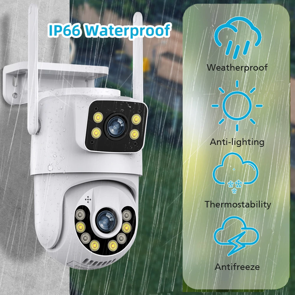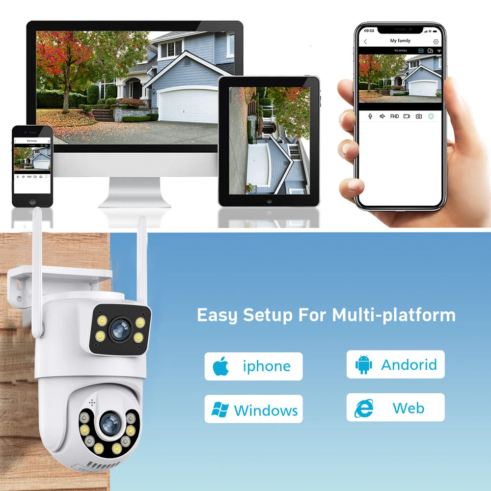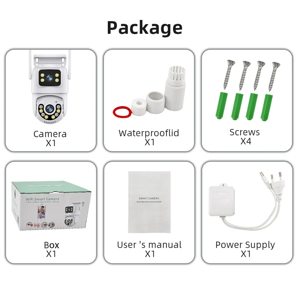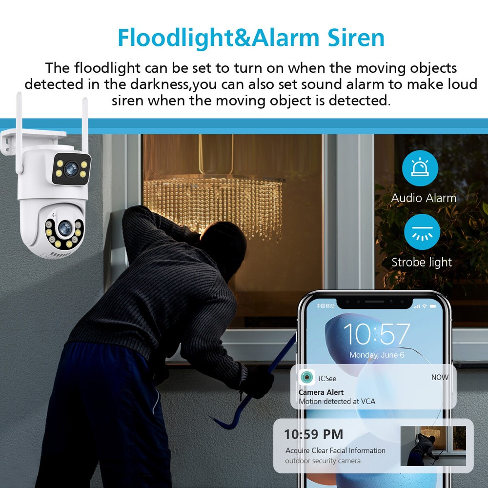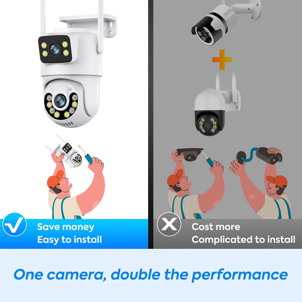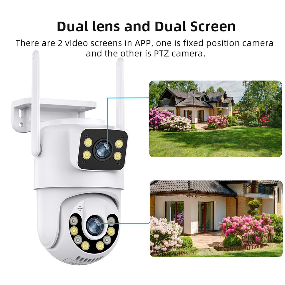 Dual Lens 3MP+3MP PTZ Security Wireless Outdoor Camera Light Alarm 2.4G WiFi 6MP Wifi Camera Dual Lens Screen Ai Human Detect Auto Tracking Wireless Outdoor Waterproof Surveillance Camera Security PTZ 3K 6MP HD Dual-Lens PTZ Outdoor Camera 3K 6MP camera, which means single lens is 3MP ,so dual lens is 3MP+3MP= 3K 6MP 3K Wired WiFi Outdoor Camera 6MP Dual Lens Security Camera PTZ Camera w/Auto Tracking 2.4GHz Wi-Fi Motion Detection Color Night Vision Cam Description: 6MP camera version: Means that the single lens is 3MP, so the dual-lens is 3MP+3MP=6MP. 3 million bullet camera, 3 million dome, screen up and down splicing into 6 million, clear and detailed images Dual Lens and Dual Screen:There are 2 video screens in APP, the upper one is fixed position camera and the lower one is PTZ camera. Dual-Lens with Dual Screen Auto Tracking PTZ WIFI Camera Dual lens, Dual screen, Notifications alarm, humanoid tracking, two way voice intercom 360 monitoring, full color night vision, IP66 waterproof, mobile phone remote monitoring,Share video, SD card storage, 24 hours video recording Specification: Name: 6MP Binocular HD Wireless WiFi Network Camera APP:ICSEE Color: White Waterproof Grade: IP66 Lens: 3.6mm Pixels: 6MP (3MP+3MP) Total Resolution: 2304*2592 (Single Pixel: 3MP) Sensors: Two 3 Million High-performance Cmos Sensors. PTZ Control: Horizontal Rotation: 270° Vertical: 90° Intelligent Analysis: Supporting Humanoid Detection Tracking Function: Support Humanoid Tracking. Light Source: 8pcs White Led + 8pcs Infrared Led. Lighting Mode: Starlight Full Color/Infrared Night Vision/Double Light Alert Night Vision Mode: 3 Modes (Infrared Night Vision, Full-color Night Vision, Double-light Warning) Night Vision Distance: About 10 Meters (Varies with the Environment) Two-way Voice: Support Support Protocol: Support Netip Protocol and Onvif Protocol. Network Interface: 10m/100m Adaptive Ethernet Port. Storage Interface: Local Tf Card (Maximum Support 128g, TF Card Is Not Included ) Cloud Storage: Support( No free ) Recording Mode: Manual Recording, Alarm Recording Reset Key Interface: Support One-button Factory Setting Recovery. Power Consumption: 10W Operating Environment: Minus 10℃-60℃, Humidity less than 90%. Power Supply: DC 12V Alarm Action: Mobile Phone Client Push Connection: Bluetooth Connection & Wifi Connection & Network Cable Connection Network Connection: Wifi Network Interface: Only Supports Wi-fi/802.11/B/G (2.4ghz); Does Not Support 5 Ghz Wireless Standards: IEEE802.11B, 802.11G, 802.11N Features: 1. Dual Camera & Dual Screen: Our Dual Lens house camera indoor has two 3MP lenses. You can monitor two areas at the same time. The lower camera can rotate 270° horizontally and 90° vertically. The higher lens is fixed. 2. AI Human Detection Alerts: Quickly finds human targets and immediately sends App notifications to your phone so you can see what's happening anywhere. 3. AI Auto Tracking: When someone passes through the protected area, the camera will detect the person's movement and follow the person. 4. Smart Night Vision: Built -in White LED and IR LED, you can choose color night vision or infrared black and white night vision. 5. Two Way Audio: Built in microphone and speaker,support real time video,you can talk to your friends,vistors or family through ICSEE APP anytime, anywhere, or scare away uninvited guests. 6. 2.4Ghz Wifi Connection & LAN Connection: Powered by DC12V adapter, you can connect the camera to Wi-Fi network. you can setup wifi connection of the camera or LAN Search with network cable connected to router, work with 2.4G wifi only (Does not support 5G). 7. Support TF Card Storage and Cloud Storage: The camera supports up to 128GB TF card (not include tf card) ,automatic loop recording and also provides cloud storage service (Need to pay extra cost). 8. IP66 Waterproof / Dustproof: The camera is equipped with IP66 case , which is waterproof, sun-proof and dust-proof. It is suitable for any environment. 9. Remote Access/Multi-User: Share the same camera with your families , let all of you protect and pay more attention to your house.It let you be able to view the live situation of your house wherever you are , just with the APP account on the app via your Smartphone or tablet. Package List: 1 x Camera 1 x Power Adapter 1 x Instructions 1 x Screw Bag 1 x Waterproof Cap Accessories Kit Note: The memory card of the camera cannot be lower than Class 6 or higher, and Class 10 is recommended. The larger the number, the better the storage effect FAQ: Q1: Do cameras really have 6MP pixels? A1: 3K 6MP camera, which means single lens is 3MP ,so dual lens is 3MP+3MP= 3K 6MP Q2: What should I do if the device is connected but cannot talk? A2: In the lower left corner of the APP monitoring screen, click the "horn" button, and press and hold the "microphone" button to speak, you can release the "microphone" button after speaking; Q3: What should I do when the SD card cannot be recognized? A3: Please turn off the power of the camera, then insert the card first, and then reconnect the wifi after power on (it is wrong to insert the card after connection); Q4: What software does this camera support? A4: Support icsee. Q5: Does it support 5G WiFi ? A5: 5G WIFI is not supported, it only supports 2.4G WIFI; If you use 5g router, 5G and 2.4G use the same connection hotspot (that isSSID is the same), you can connect directly.lf 5G and 2.4G are not the same connection hotspot (that is,SSID is different, generally SSID of2.4G is xxxxx-2.4G,SSID of 5G is xxxxx-5G),please connect WiFi of mobile phone to hotspot of xxxxX-2.4G ofrouter before configuring camera. Q6: How to set up "Auto Tracking"? A6: In the upper left corner of the functional area of the APP monitoring screen, click "Mobile Tracking", and click the "On/Off" button; Q7: How to do if the camera is not connected or offline? A7: 1.Check if the camera power or network of router normally 2.Plug the camera power to restart camera. 3.R