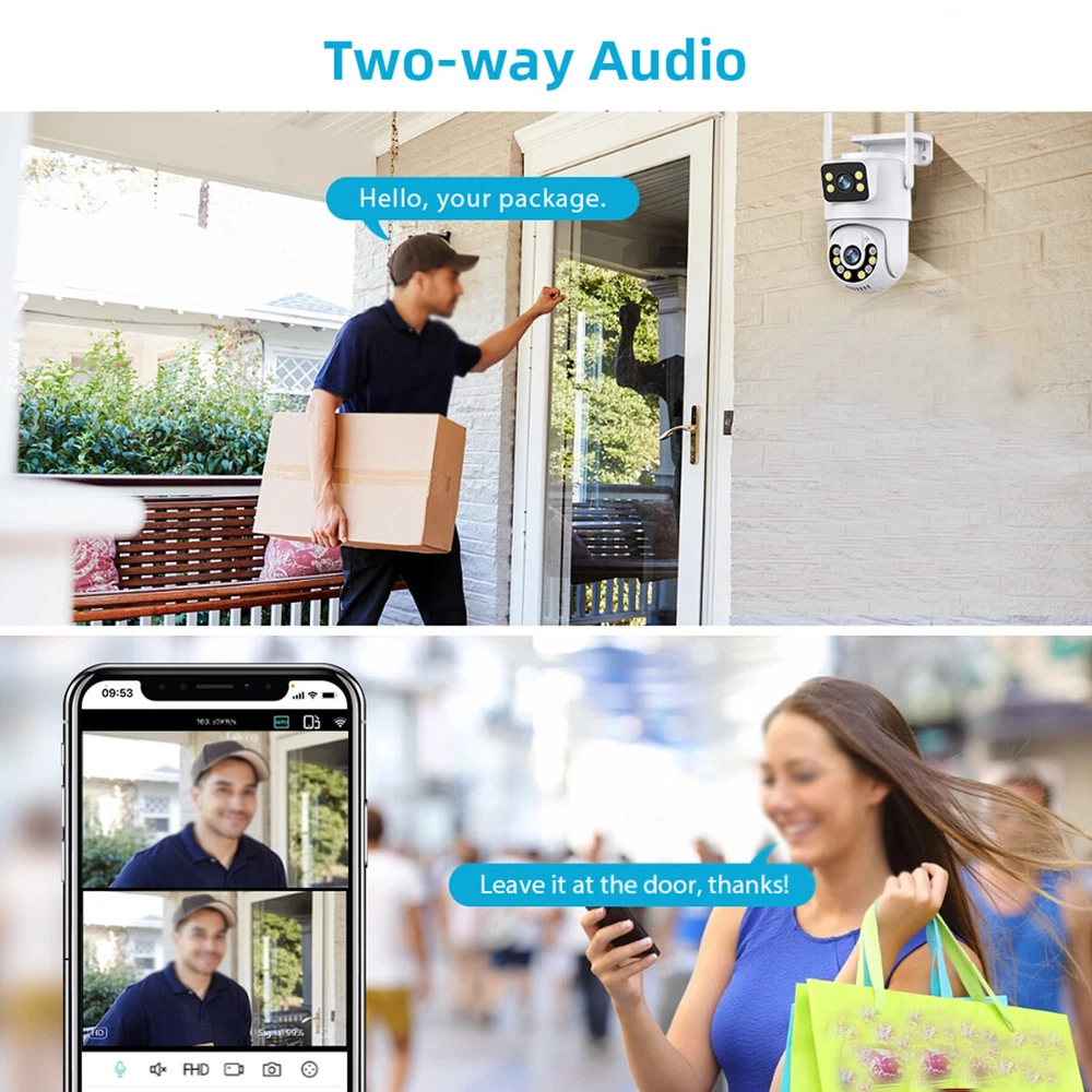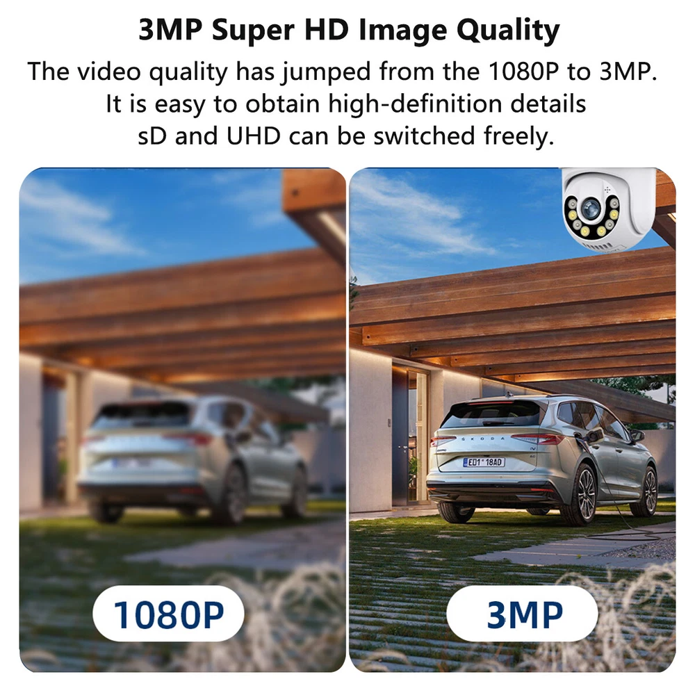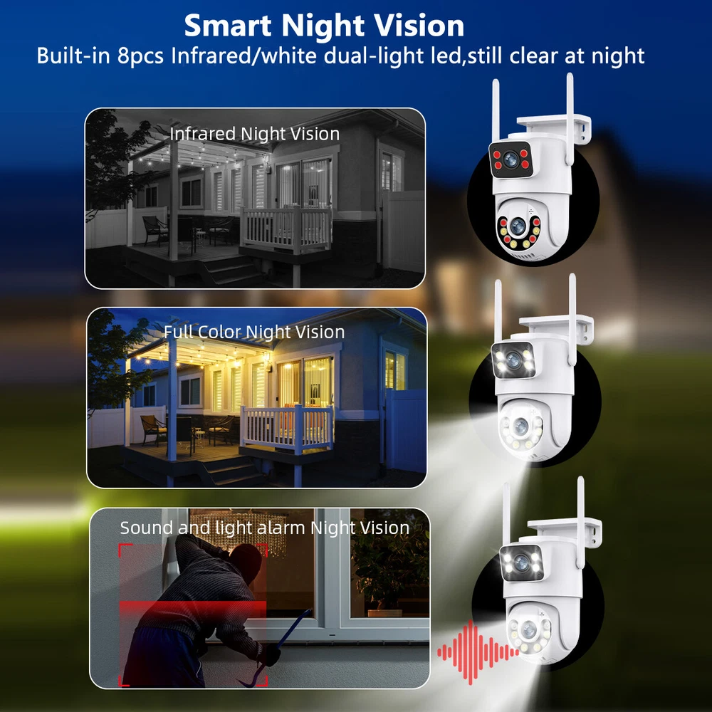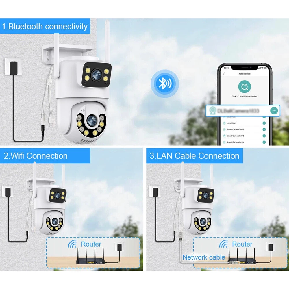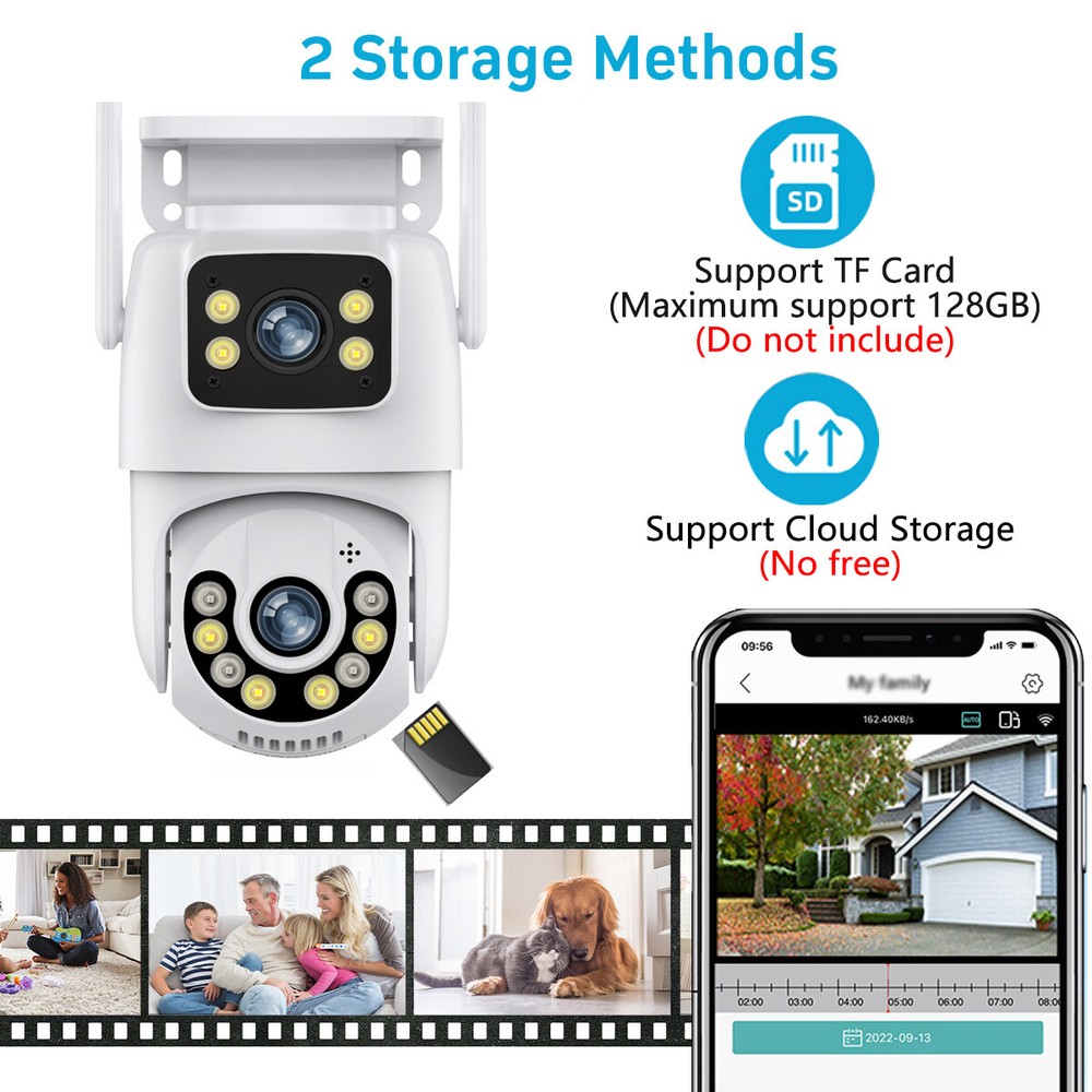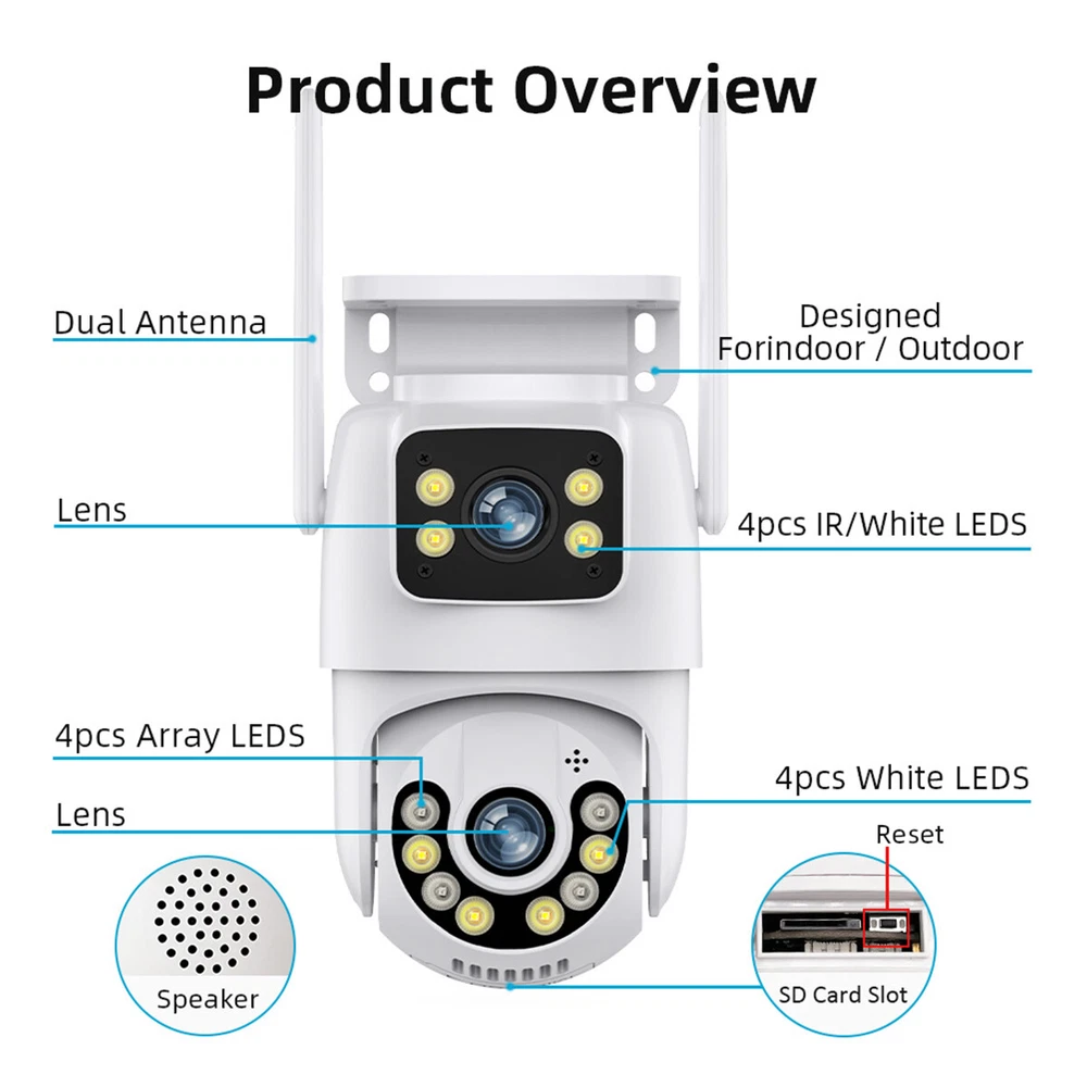 Dual Lens 3MP+3MP PTZ Security Wireless Outdoor Camera Light Alarm 2.4G WiFi 6MP Wifi Camera Dual Lens Screen Ai Human Detect Auto Tracking Wireless Outdoor Waterproof Surveillance Camera Security PTZ 3K 6MP HD Dual-Lens PTZ Outdoor Camera 3K 6MP camera, which means single lens is 3MP ,so dual lens is 3MP+3MP= 3K 6MP 3K Wired WiFi Outdoor Camera 6MP Dual Lens Security Camera PTZ Camera w/Auto Tracking 2.4GHz Wi-Fi Motion Detection Color Night Vision Cam Description: 6MP camera version: Means that the single lens is 3MP, so the dual-lens is 3MP+3MP=6MP. 3 million bullet camera, 3 million dome, screen up and down splicing into 6 million, clear and detailed images Dual Lens and Dual Screen:There are 2 video screens in APP, the upper one is fixed position camera and the lower one is PTZ camera. Dual-Lens with Dual Screen Auto Tracking PTZ WIFI Camera Dual lens, Dual screen, Notifications alarm, humanoid tracking, two way voice intercom 360 monitoring, full color night vision, IP66 waterproof, mobile phone remote monitoring,Share video, SD card storage, 24 hours video recording Specification: Name: 6MP Binocular HD Wireless WiFi Network Camera APP:ICSEE Color: White Waterproof Grade: IP66 Lens: 3.6mm Pixels: 6MP (3MP+3MP) Total Resolution: 2304*2592 (Single Pixel: 3MP) Sensors: Two 3 Million High-performance Cmos Sensors. PTZ Control: Horizontal Rotation: 270° Vertical: 90° Intelligent Analysis: Supporting Humanoid Detection Tracking Function: Support Humanoid Tracking. Light Source: 8pcs White Led + 8pcs Infrared Led. Lighting Mode: Starlight Full Color/Infrared Night Vision/Double Light Alert Night Vision Mode: 3 Modes (Infrared Night Vision, Full-color Night Vision, Double-light Warning) Night Vision Distance: About 10 Meters (Varies with the Environment) Two-way Voice: Support Support Protocol: Support Netip Protocol and Onvif Protocol. Network Interface: 10m/100m Adaptive Ethernet Port. Storage Interface: Local Tf Card (Maximum Support 128g, TF Card Is Not Included ) Cloud Storage: Support( No free ) Recording Mode: Manual Recording, Alarm Recording Reset Key Interface: Support One-button Factory Setting Recovery. Power Consumption: 10W Operating Environment: Minus 10℃-60℃, Humidity less than 90%. Power Supply: DC 12V Alarm Action: Mobile Phone Client Push Connection: Bluetooth Connection & Wifi Connection & Network Cable Connection Network Connection: Wifi Network Interface: Only Supports Wi-fi/802.11/B/G (2.4ghz); Does Not Support 5 Ghz Wireless Standards: IEEE802.11B, 802.11G, 802.11N Features: 1. Dual Camera & Dual Screen: Our Dual Lens house camera indoor has two 3MP lenses. You can monitor two areas at the same time. The lower camera can rotate 270° horizontally and 90° vertically. The higher lens is fixed. 2. AI Human Detection Alerts: Quickly finds human targets and immediately sends App notifications to your phone so you can see what's happening anywhere. 3. AI Auto Tracking: When someone passes through the protected area, the camera will detect the person's movement and follow the person. 4. Smart Night Vision: Built -in White LED and IR LED, you can choose color night vision or infrared black and white night vision. 5. Two Way Audio: Built in microphone and speaker,support real time video,you can talk to your friends,vistors or family through ICSEE APP anytime, anywhere, or scare away uninvited guests. 6. 2.4Ghz Wifi Connection & LAN Connection: Powered by DC12V adapter, you can connect the camera to Wi-Fi network. you can setup wifi connection of the camera or LAN Search with network cable connected to router, work with 2.4G wifi only (Does not support 5G). 7. Support TF Card Storage and Cloud Storage: The camera supports up to 128GB TF card (not include tf card) ,automatic loop recording and also provides cloud storage service (Need to pay extra cost). 8. IP66 Waterproof / Dustproof: The camera is equipped with IP66 case , which is waterproof, sun-proof and dust-proof. It is suitable for any environment. 9. Remote Access/Multi-User: Share the same camera with your families , let all of you protect and pay more attention to your house.It let you be able to view the live situation of your house wherever you are , just with the APP account on the app via your Smartphone or tablet. Package List: 1 x Camera 1 x Power Adapter 1 x Instructions 1 x Screw Bag 1 x Waterproof Cap Accessories Kit Note: The memory card of the camera cannot be lower than Class 6 or higher, and Class 10 is recommended. The larger the number, the better the storage effect FAQ: Q1: Do cameras really have 6MP pixels? A1: 3K 6MP camera, which means single lens is 3MP ,so dual lens is 3MP+3MP= 3K 6MP Q2: What should I do if the device is connected but cannot talk? A2: In the lower left corner of the APP monitoring screen, click the "horn" button, and press and hold the "microphone" button to speak, you can release the "microphone" button after speaking; Q3: What should I do when the SD card cannot be recognized? A3: Please turn off the power of the camera, then insert the card first, and then reconnect the wifi after power on (it is wrong to insert the card after connection); Q4: What software does this camera support? A4: Support icsee. Q5: Does it support 5G WiFi ? A5: 5G WIFI is not supported, it only supports 2.4G WIFI; If you use 5g router, 5G and 2.4G use the same connection hotspot (that isSSID is the same), you can connect directly.lf 5G and 2.4G are not the same connection hotspot (that is,SSID is different, generally SSID of2.4G is xxxxx-2.4G,SSID of 5G is xxxxx-5G),please connect WiFi of mobile phone to hotspot of xxxxX-2.4G ofrouter before configuring camera. Q6: How to set up "Auto Tracking"? A6: In the upper left corner of the functional area of the APP monitoring screen, click "Mobile Tracking", and click the "On/Off" button; Q7: How to do if the camera is not connected or offline? A7: 1.Check if the camera power or network of router normally 2.Plug the camera power to restart camera. 3.R