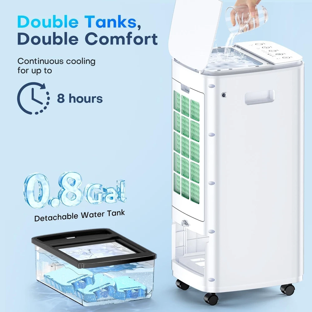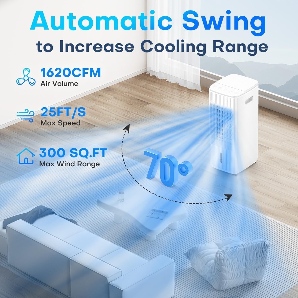 [3-in-1 Cooler] BALKO combines a fan, air cooler, and humidifier in one. Just add water and ice packs (3 included) and press the cooling button for instant comfort. Check for ice packs in the top and bottom tanks upon delivery. [Cools Up to 250 Sq.Ft] With a 25" height and 70° oscillation, it delivers powerful airflow (1500 CFM) without needing to bend over. Ideal for seniors and pregnant users. [Dual Water Tanks] Removable water tanks, cooling pad, and wheels make cleaning and moving easy. Built-in safety features include circuit protection and pinch-proof grilles. [No Installation Required] Plug-and-play with no hoses or windows needed. Uses only 60W—cuts energy use and maintenance costs. [Customizable Comfort] Offers 2 modes (Normal/Cooling) and 3 fan speeds (16–25 ft/s), suitable for sleep, workouts, or daily use. [Remote + Top Control] Easy control via remote (up to 16ft) or top panel. Clear icons make it user-friendly for all ages. [Quiet & Timed Operation] Runs quietly at