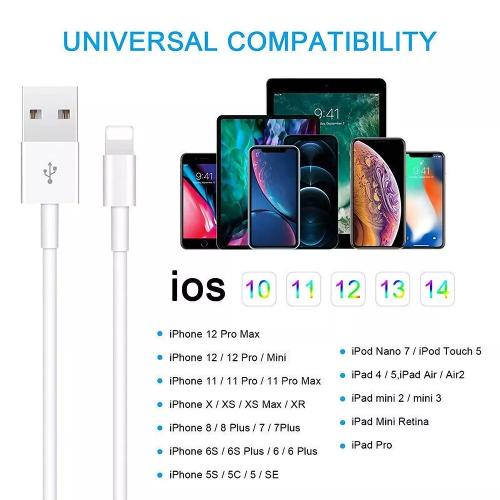 eBay eBay For iPhone Charger Cable: Full Support with iOS versions and all future updates Strong and durable premium material support upto 5500 times bending High coverage aluminum foil makes data transmission is not disturbed by external signals Gold-plated C48 terminal and tinned copper material ensures charging performance increased by 30% Fast Charging speed and High Speed transmission Compatible with Devices: For iPhone SE 2020/13/12/11/ Pro/Max/iPhone Xs/Max/XR/X/8/8 Plus For iPhone 7/ 7 Plus / 6s Plus / 6s / 6 Plus For iPhone 5s / 5c / 5 / SE For iPad Pro / iPad Air / Air 2 For iPad mini 2 / mini 3 / mini 4 For iPad 4th gen For iPod Touch 5th gen / iPod Nano 7th gen and Beats Pill+ Package Included : 1/3 Pack cable User Tips : When pulling out the data cable, please pull the end of the data cable instead of pulling the rope of the data cable violently. If the data cable gets wet with water, please wipe it dry before using it. If there is a black dot in the middle of the chip of the data cable after a long time of use, it will affect the phenomenon of unstable charging during the charging process. Wipe clean with an eraser to resume normal use.