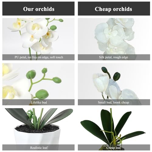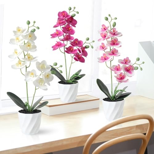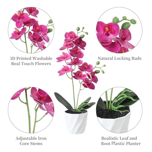 Features: Perfect for Indoor and Outdoor DecorationThis potted orchid flower is a symbol of beauty and blessing. Its elegant appearance and vibrant energy also represent your optimistic attitude towards life and your wishes for your family and friends, it not only decorates your life, but also represents your love for everything around you! Material & SizeBeautiful orchid made of high quality silk, soft and lifelike, flexible material allows for easy to bend and reshape and will not harm your health or that of your family. The fake flower bonsai with height 17.7 inches, the diameter of Flowerpot 3.3 inches. Applicable to Many Scenes Fake butterfly orchids are moderate in size and fit perfectly into any corner of your home, creating a landscape of its own. Excellent for your office, home, bedroom, living room, bathroom, kitchen, balcony, table, desk, counter, or any area you see fit. Best Wishes This phalaenopsis potted plant is perfect as a gift for your friends, family, loved ones on special days like christmas, birthday, moving house, etc. The beautiful orchids are just like your love, hot and sharp and pure! No Need CareEnjoy the long-lasting beauty without having to worry about sunlight, watering,pruning or other maintenance, the artificial plant would never wither and death. Just keep your fake orchids clean by wiping them occasionally with a damp cloth.