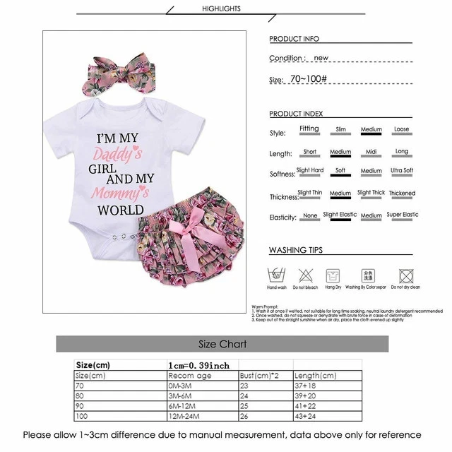 Description Specifications: Style:Casual Collar:O-Neck Closure Type:Pullover Gender:Baby Girl Pattern Type:Letter,Floral Occasion:Everyday Material:95% cotton + 5% spandex Season:Summer Sleeve Style:Regular Age Range:3-24M Color:As the picture Sleeve Length:Short Fit:Fits true to size, take your normal size Size Chart: Size------Tops length ----Bust*2----------Pants length-------Age Recommended 70-------- 37cm/14.56"------23cm/9.05"------18cm/7.08"------ 0-3M 80----------39cm/15.35"------24cm/9.44"-----20cm/7.87"--------3-6M 90----------41cm/16.14" -----25cm/9.84"------23cm/9.05"--------6-12M 100----------43cm/16.92" ------26cm/10.23"------24cm/9.44"-----12-24M Feature: 100% brand new and high quality. Made of 95% cotton and 5% spandex, soft touch, do not harm baby's skin Summer baby print short sleeve romper and shorts with a headband, stylish and make your little kids look more attractive The clothes set have 4 sizes, S/M/L/XL, suitable for baby from 3 to 24 months wear in summer Both machine wash and hand wash are available. Suit for daily wear, picnic and photo shoot Please carefully refer to the Size Chart in product description before purchase. Package included: 1 x bodysuit +1 x shorts+1 x headband Note: 1inch=2.54cm 1.Please allow 1-2 cm error due to manual measurement. pls make sure you do not mind before you bid. 2.Due to the difference between different monitors, the picture may not reflect the actual. Detail Image Delivery Time: USA To USA: shipped by USPS, 2-4 working days UK&AU To UK&AU: shipped by Royal Mail , 1-3 working days China To USA: shipped by China Post Epacket, 7-15 working days China To UK&AU: shipped by China Post Epacket, 15-25 working days China To Other Countries: shipped by China Post Epacket, 25-35 working days Shipments & Payment: Your order will be handled within 1-2 business days after receiving your clear payment. Weekend excluded Tracking number will be provided for you ASAP. We accept PayPal. Return Policy: If you are not satisfied with the items, you can return for refund within 30 days after receives it. Buyer pay the shipping cost for return. contact me for the return address, we will refund your money within 2 days after receive the returned items. About Feedback: I appreciate your Positive comment and 5 star DSR(Detailed Seller Ratings) if you are satisfied with the items and my job, I will do better because of your encouragement. Also I will leave Positive feedback to you once I receive yours, thank you very much! Please do Not leave Neutral or Negative feedback and low DSR if you are not happy with the transaction, I think most problems can be resolved through sincere communication. We try our best to reply to your emails ASAP. However, due to high volume of daily incoming emails and time zone difference, we may not be able to reply your emails immediately. Please allow 1-2 business day for us to reponse. Please feel free to contact me if you have any question, I'll try my best to solve it for you.