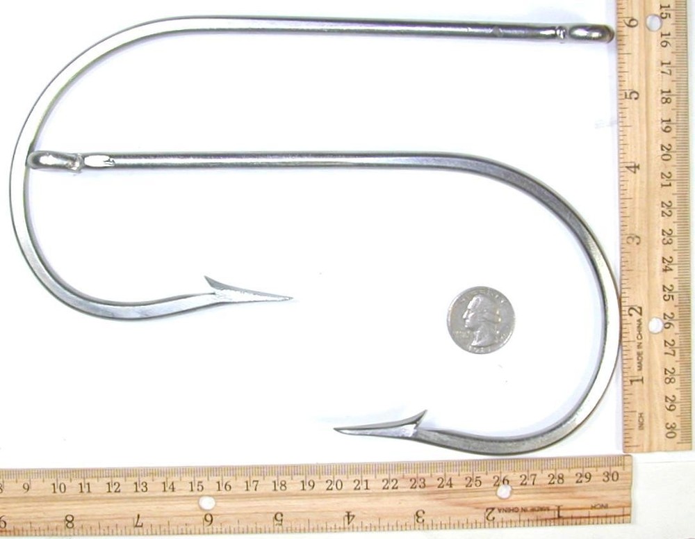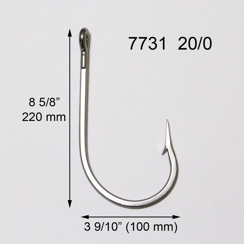 7731 Stainless Steel Super Large shark Fishing Hook Big Game Fish Tuna Bait 20/0 Description 1) Sea Demo n Big Game Fishing hook 2) Model Number: 7731 3) Material: Stainless Steel 4) Size: 20/0 5) Quantity: 3 PCS 6) Packaging: opp bag Forged, knife edge long point Tapered Brazed Ring Extra Strong and Sharp!!!