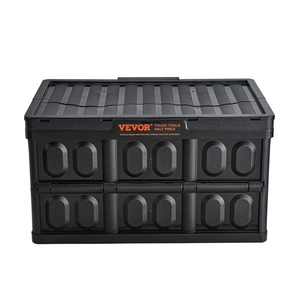Features: Meet Your Space Giant: Dive into 45L of roomy storage with our collapsible storage bin, easily accommodating a large number of items. Whether you're doing bulk shopping or daily tidying, we have got you covered. Say goodbye to cluttered trunks. Hello, easy, breezy organizing! Space-Saver Alert: When not in use, the collapsible grocery bin can be easily folded up, occupying minimal storage space. Slip it into your car trunk or that cozy corner in your storage room. Pop open or shut in just 60 seconds. Convenience redefined. High-Quality PP Material: Think durability but without the rust. Our collapsible plastic storage bin, fashioned from top-notch PP material, stands strong and reliable. Plus, it's safe and friendly for all your storage adventures, indoors or out. Carry with Flair: Featuring two ergonomic handles, transportation becomes a breeze. No more huffing and puffing! There's no need to strenuously drag it upright. Tilt or lay flat, and off you go. Our collapsible box is all about making your moves smooth. Not Just a Box: From car transportation, road trips, and camping escapades to that big move or maybe just your garage – this collapsible bin fits in, stands out and assures reliability wherever it goes. Welcome to versatile storing! VEVOR 45L Collapsible Storage Bins Get ready to turn your trunk into a storage wonderland! With a solid lid, organizing your cargo has never been easier. Big items or bigger items, this collapsible storage bin can handle it all. When it's off-duty, this collapsible grocery bin folds down, giving your space back. No more being bossed around by bulky boxes. Unfold or tuck it away – your choice, your freedom. Made from premium PP, our collapsible bin is tough as nails and won't rust. Ditch those flimsy storage solutions; this is the sturdy companion you've been waiting for! The collapsible box features ergonomic handles to make moving a breeze. Designed for an easy grip, it balances the weight so you don't have to do all the heavy lifting. More balance, less hassle! Be it your trunk, camping trips, garage, or home – this collapsible plastic storage bin is your go-to. Space-saving, damage-protecting, and waterproof traits make it perfect for every day and the great outdoors alike.