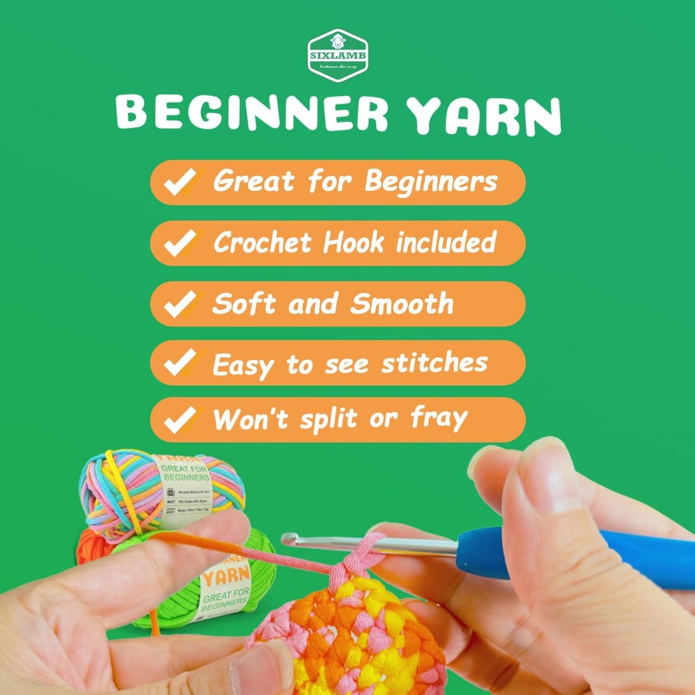 **Premium Beginner-Friendly Craft Yarn - 3-Pack Bundle (1.8 oz/60 yards each)** Discover the perfect easy yarn for your crafting journey with our specially designed beginner-friendly yarn. Each pack includes three skeins, with each skein weighing 1.8 oz and measuring 60 yards, providing ample material for your creative projects. **Why Choose Our Yarn?** Our yarn stands out from the rest due to its superior quality and thoughtful design. Made from 75% cotton and 25% nylon, this yarn offers a perfect balance of softness and durability. Unlike ordinary yarn, it is tightly spun to prevent splitting and breaking, ensuring a smooth and frustration-free experience for beginners. The clear stitch definition also makes it easier to see your progress, making it ideal for those just starting. **Exclusive Color Options** Our yarn comes in a variety of custom-dyed colors, featuring vibrant, multi-hued options that are perfect for creating one-of-a-kind projects. Each colorway is carefully selected to bring your creations to life, making every piece truly unique. **Complete with Tools, Accessories, and Tutorials** We’ve thought of everything to help you get started. This bundle includes all the essential tools and accessories, along with a basic tutorial guide, ensuring you have everything you need to bring your creative ideas to life. **Versatile Use** Whether you're crocheting adorable amigurumi animals, crafting stylish home decor, or knitting fashionable garments and accessories, our yarn is up to the task. Its versatility makes it suitable for a wide range of projects, ensuring that your creativity knows no bounds. --- This version includes the additional feature of the kit providing all necessary tools, accessories, and a basic tutorial. 【Premium Materials for Smooth Crocheting】 Beginner Yarn is crafted from a 75% cotton and 25% nylon blend;Worsted medium weight #4;Machine wash cold and dry; this high-quality, soft crochet yarn ensures a smooth and durable crocheting experience. 【Great for Beginners】Unlike traditional acrylic or wool yarn that may split,pill,fray,or snag,The easy-to-see stitches crochet yarn makes it easy to work with for those learning to crochet, avoiding splitting or breaking. Ideal for adults or kids who want to learn to crochet. 【Crochet Starter Kit】This crochet yarn set includes 3 skeins of cotton-nylon blend yarn, 1.76 oz / 50 g, 60 yds / 55 m per skein; and a 4.0mm crochet hook, 3 stitch markers, 4 safety eyes, and a plastic needle, providing everything needed to start crocheting immediately. 【Unique Colors & Versatile Yarn】Choose from a stunning palette of 23 yarn colors, featuring 11 solid shades and 12 variegated blends. These colors are carefully selected to ensure your projects have a unique and eye-catching appeal. Whether you're making amirugumi toys, blanket, or home décor, the vibrant hues bring your creations to life. This versatile yarn is perfect for beginners exploring different styles and projects, allowing for endless creativity in crocheting and knitting projects. 【Knitting Gauge】 Knitting gauge of 4” x 4” (10 cm x 10 cm) 20 sts and 28 rows with a 5.0mm (U.S. 9) knitting needle 【Crochet Gauge】 Crochet gauge of 4” x 4” (10 cm x 10 cm) 13 sc and 14 rows with a 4.5mm (U.S. H-8) crochet hook 【Perfect Gift】multicolor beginner easy yarn kit is a perfect gift for craft lovers, offering everything needed to start a new, rewarding hobby! It's always a fun adventure to crochet patterns with our beginner yarns.Let's just enjoy the endless possibilities!
