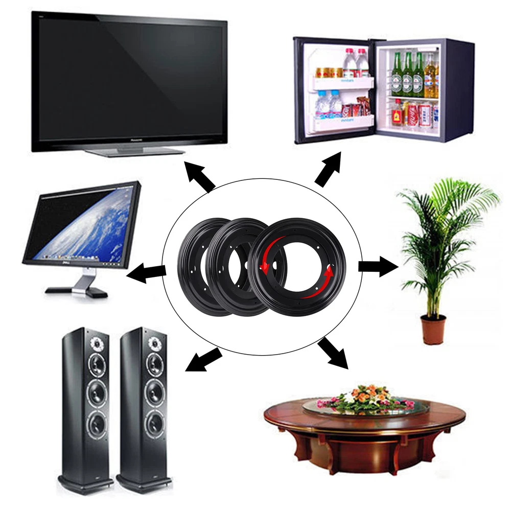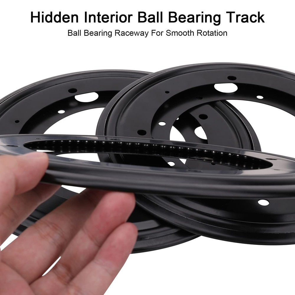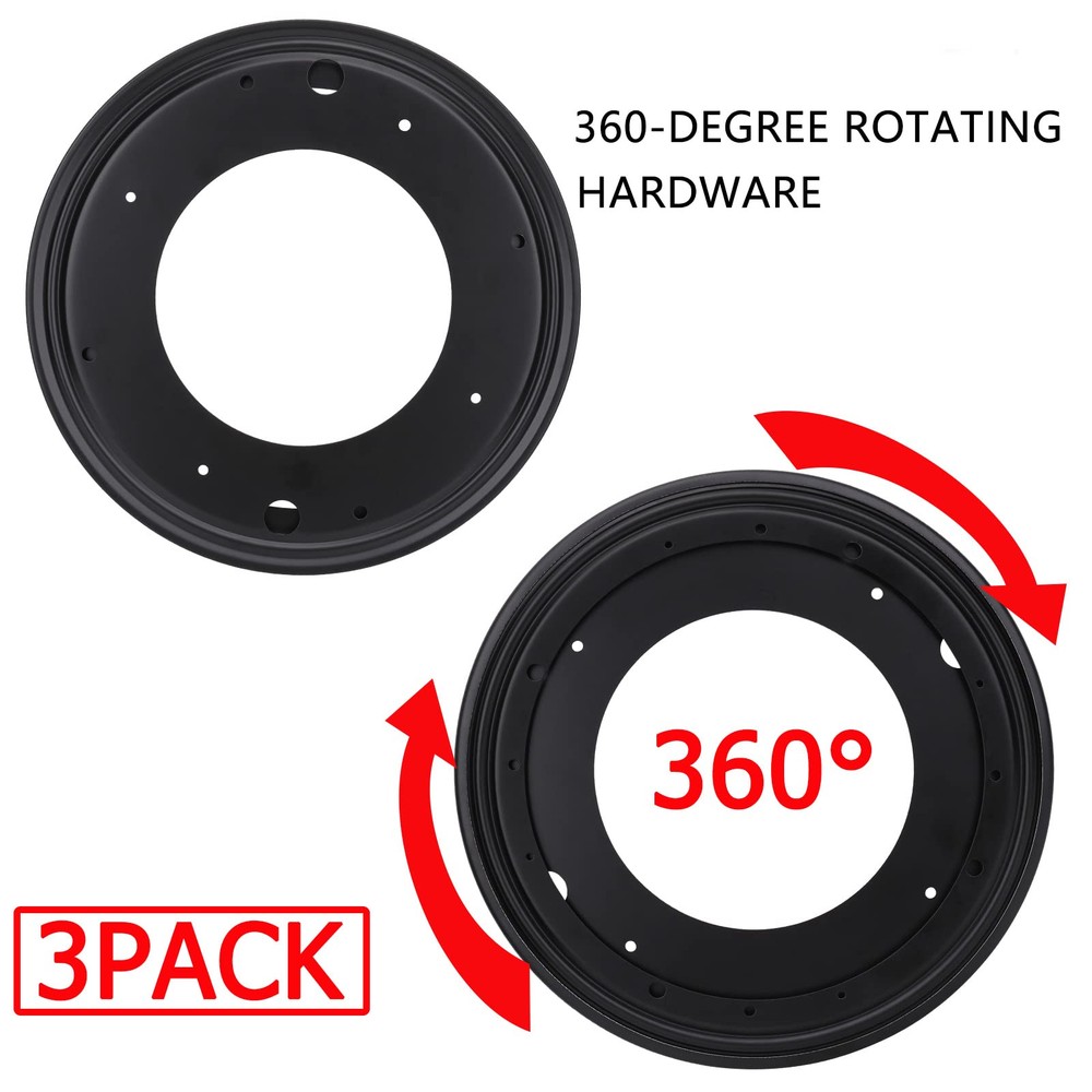 【PREMIUM LAZY SUSAN TURNTABLE BEARINGS】Made of high quality galvanized steel with black coated, rust resistant and built to last, can safely handle loads up to 700lbs. 【LOW NOISE & 360° SMOOTH ROTATING】The Lazy Susan Turntable revolves on stainless steel ball bearings, providing solid support and easy to spin, allowing for efficient operation and maximum stability, not cranky or disturbing. 【EASY TO INSTALL】Each lazy susan turntable organizer has pre-punched screw holes for the inner and outer rings for quick installation. Everything can be turned into a Lazy Susan 【VERSATILE USAGES】Lazy Susan is widely used for organizing space and displaying products, ideal for table turning, cake decorating, food serving trays, spice rack organizer, and so on. 【PACKAGE INCLUDES】3pcs 8" Round Lazy Susan Ball Bearing Turntable; 5/16" in thickness.