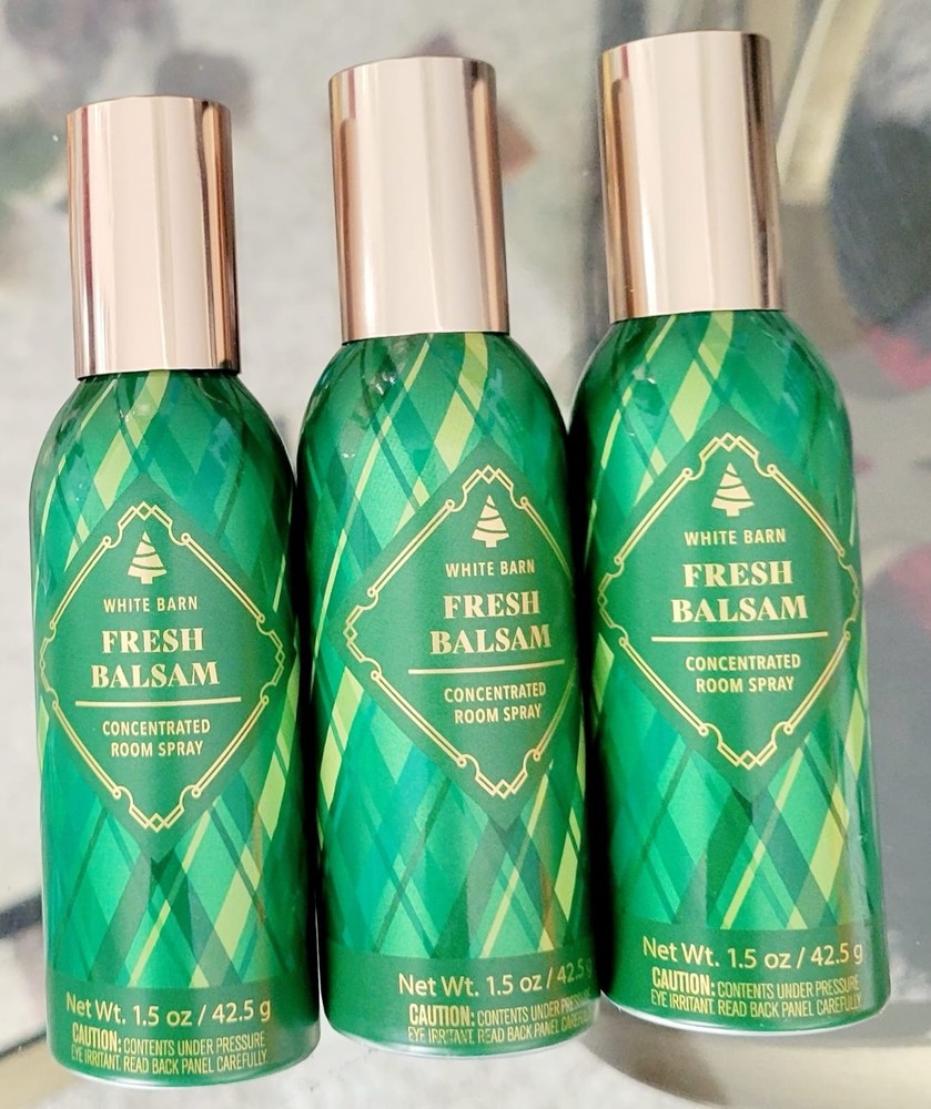 This is a set of three Bath & Body Works Fresh Balsam concentrated room spray air fresheners with a vanilla scent. The concentrated formula is designed to quickly freshen up any room with a festive and inviting aroma. Perfect for use in the home or office, these room sprays provide a burst of fragrance that helps create a cozy and welcoming environment. The Fresh Balsam scent adds a touch of nature and freshness to the air, making it an ideal choice for enhancing the ambiance of any space.