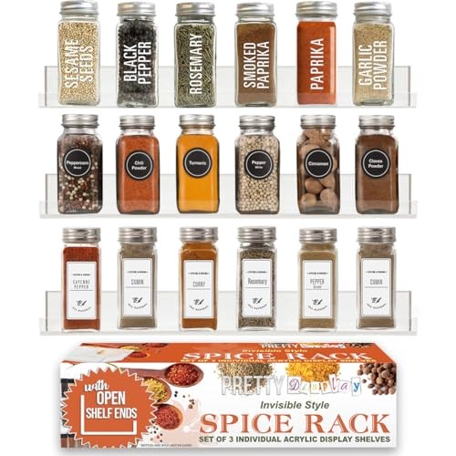 Item Length:1MPN:Does Not ApplyItem model number:PDspiceRACK-001Item Package Quantity:1Item Weight:4.64 ouncesSize:3 PackItem Height:1Batteries Included:NoItem Width:1Date First Available:August 28, 2015Manufacturer:Does Not ApplyUPC:784672267700Brand:Does Not ApplyAssembly Required:YesShelf Type:Floating ShelfColor:TransparentType:Does Not ApplyShelf Weight Capacity:10 PoundsSpecial Features:2" Shelf Suitable for Standard Store-Bought Spice JarsCustomer Reviews:4.5 out of 5 starsIs Discontinued By Manufacturer:NoNumber Of Pieces:3Room Type:Pantry, KitchenInstallation Method:Screw MountPart Number:COMINHKPR97850Included Components:HardwareSpecial Feature:2" Shelf Suitable for Standard Store-Bought Spice JarsFinish Type:Space-savingProduct Dimensions:2.4"D x 15"W x 1.75"HFinish:Space-savingBatteries Required:Nogtin13:Does Not ApplyMaterial:Premium UV Fade-Resistant AcrylicEAN:Does Not ApplyNumber of Shelves:3Mounting Type:Wall MountStyle:Open Shelf Ends