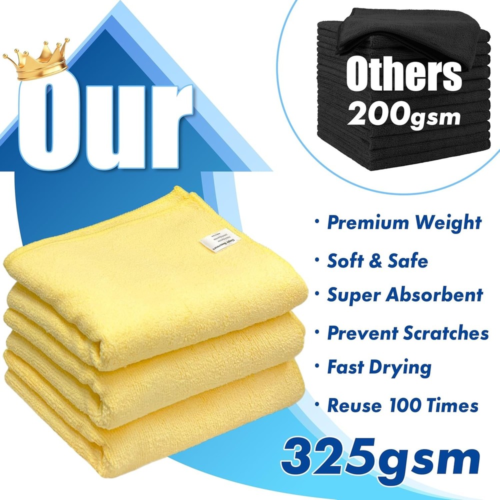 Made for Daily Household Cleaning: Ideal for kitchen counters, sinks, stovetops, bathroom surfaces, mirrors and more; also works great for cars, windows, and general cleaning tasks Premium Weight, Heavy-Duty Performance: Crafted with high-density 325 GSM microfiber for enhanced durability and absorption; heavier and more substantial than standard cleaning towels Soft-Touch and Safe on Surfaces: Non-abrasive texture is gentle on hands, cookware, appliances, and fixtures - perfect for delicate finishes and everyday use Extra Absorbent and Fast Drying: Holds up to 8 times its weight in water, making it ideal for spills, drying dishes, or wiping down bathroom counters Reusable and Eco-Friendly: Use it over 100 times with proper care - a smart and sustainable swap for wasteful paper towels Generous Size and Multi-Purpose: Each towel measures 16" x 24" - large enough for big jobs, yet easy to fold for smaller tasks in kitchen drawers or cleaning caddies