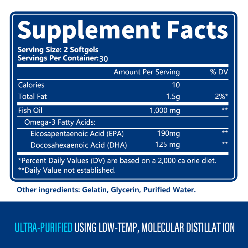 Premium Deep Sea Fish Oil Capsules – Support Heart, Brain & Joint Health! 1,000mg per Serving | High-Purity Omega-3s (EPA & DHA) --------------------------------------------------------------------------------------------------- ✨ Why Choose Our Fish Oil? ✨ ✔ 1,000mg Pure Fish Oil per softgel – Sourced from deep-sea fish for maximum purity! ✔ Rich in Omega-3s : EPA (190mg) : Promotes heart health & reduces inflammation. ❤️ DHA (125mg) : Essential for brain function & cognitive support. ✔ No Fishy Aftertaste – Enteric-coated capsules for easy digestion! ✔ Non-GMO & Gluten-Free – Quality you can trust. -------------------------------------------------------------------------------------------------- Key Benefits : → Supports cardiovascular health & healthy cholesterol levels. → Enhances memory, focus, and mood balance. → Aids joint flexibility and reduces stiffness. → Boosts immune system function. Suggested Use : Take 1-2 capsules daily with meals, or as directed by your healthcare provider. ️ Quality Assured : Manufactured in an FDA-registered facility with strict safety standards. Invest in Your Wellness Today – Feel the Difference!