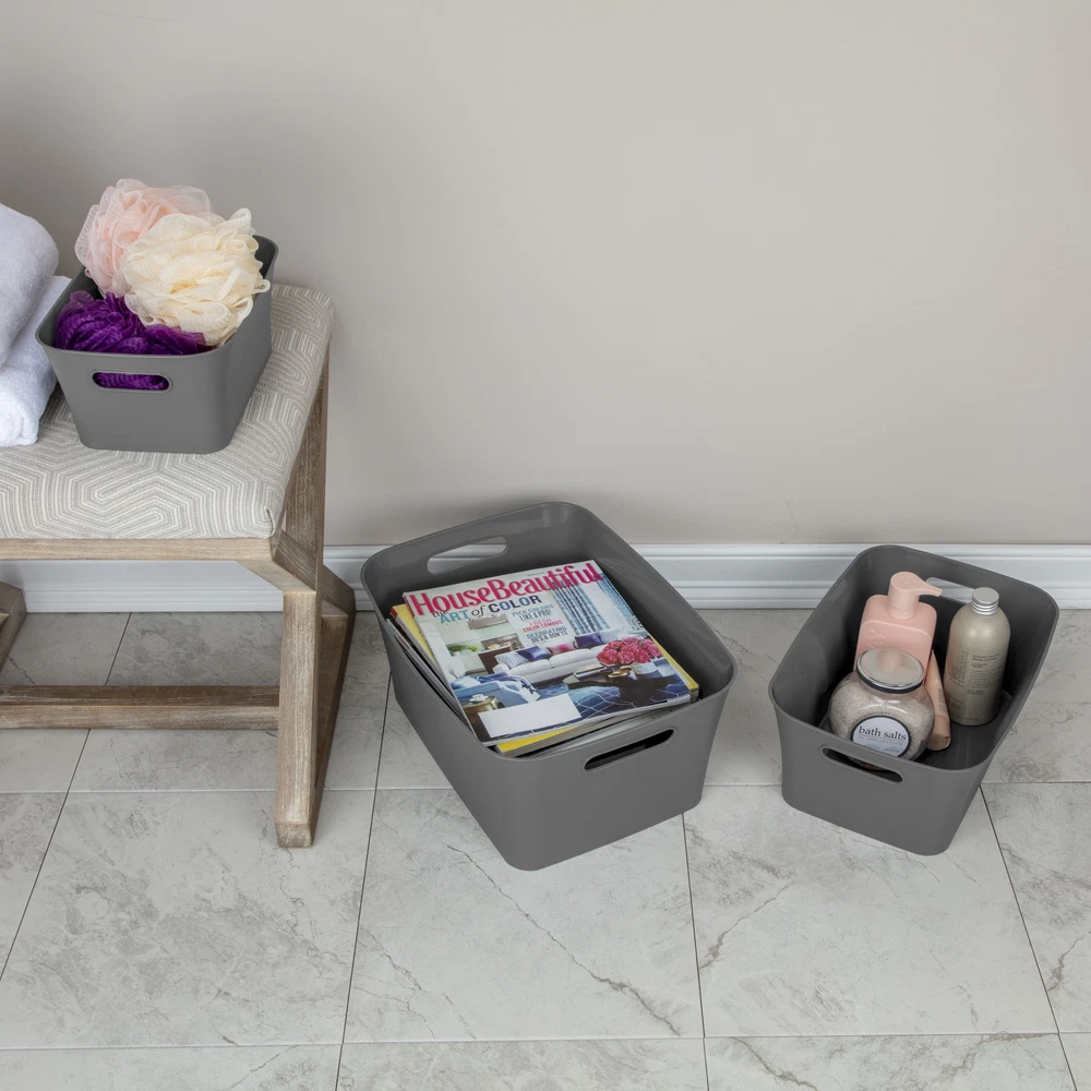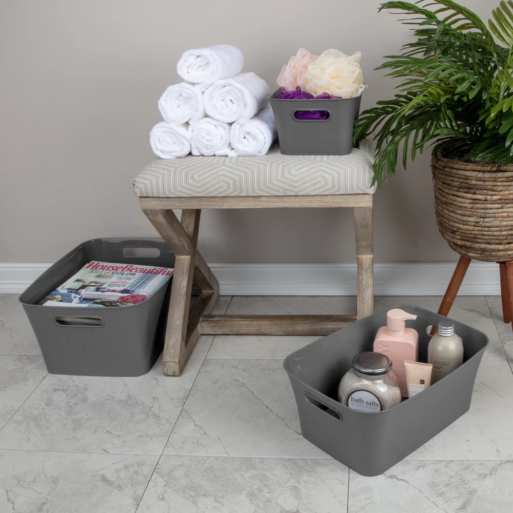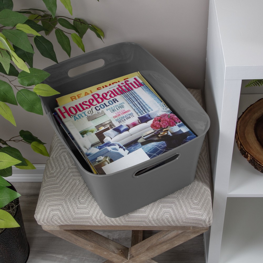 Bring order to your living spaces simply, with the classic styling of Mainstays Large Bins! Wherever and whatever you may need to organize and store, these decorative Bins will help keep your storage areas neatly contained and tidy! The versatility of these Bins allows them to be used in so many places – from dorm rooms to craft rooms, pantries to offices, bedrooms to bathrooms, and play rooms to workshops. The open design provides easy access to your stored items, as well as enables quick clean up and identification of contents at a glance. The carry-through handles make for effortless and comfortable transport, so you can bring your items wherever they are needed. Too many things for just one Bin? Create a customized storage system with multiple Large Bins, or add Small Bins and Medium Bins in coordinating colors to keep smaller items contained. Pick it up, store it away, and be on your way with our Large Bins! The overall assembled dimensions of this item are 15 1/2" L x 11 3/8" W x 7" H. About this item Mainstays Adult Plastic Large Bin Gray Flannel: Outside Dimensions: 15 1/2" x 11 3/8" x 7" Single unit option Gray Flannel Decorative Large Bins help keep you organized, while providing easy access to contents Store away household items neatly, where they are most frequently used Convenient integrated oval shaped handles allow for easy transport Ideal for use on shelves and within cabinets Textured matte exterior with polished interior for a fashionable touch Create a versatile storage system – use multiple Large Bins and / or pair with Small Bins and Medium Bins Ideal for use in the Closet, Pantry, Bathroom, Office, Kitchen, Craft Room, Play Room, Dorm Room or Mudroom BPA-free and phthalate-free Made of easy to clean plastic Mainstays Large Bin assembled weight: 0.9 lbs. On Jun 20, 2025 at 22:43:07 PDT, seller added the following information: